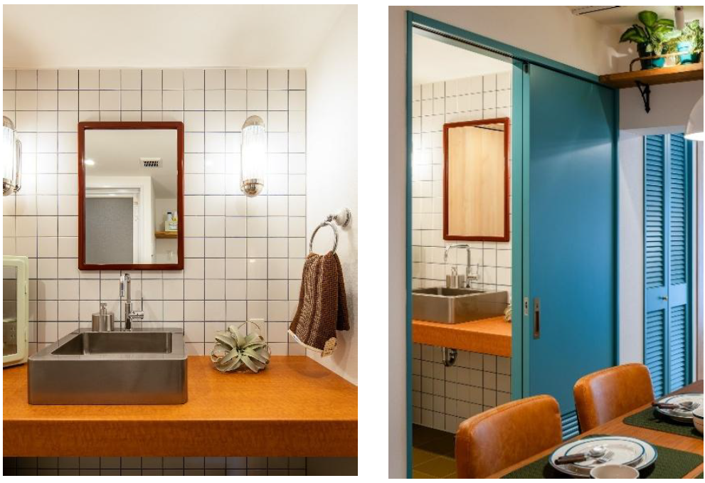 温かみのあるブリックブラウンのミラーと、ガラスのラインが印象的なウォールランプ、ネイビーのタイル⽬地が、海外のバスルームのような雰囲気に。広々としたカウンターは2⼈でも快適に使⽤でき、忙しい朝もスムーズです。ここにもグレイグリーンのダルトンホームのオリジナル建具を採⽤し、空間に個性をプラス。