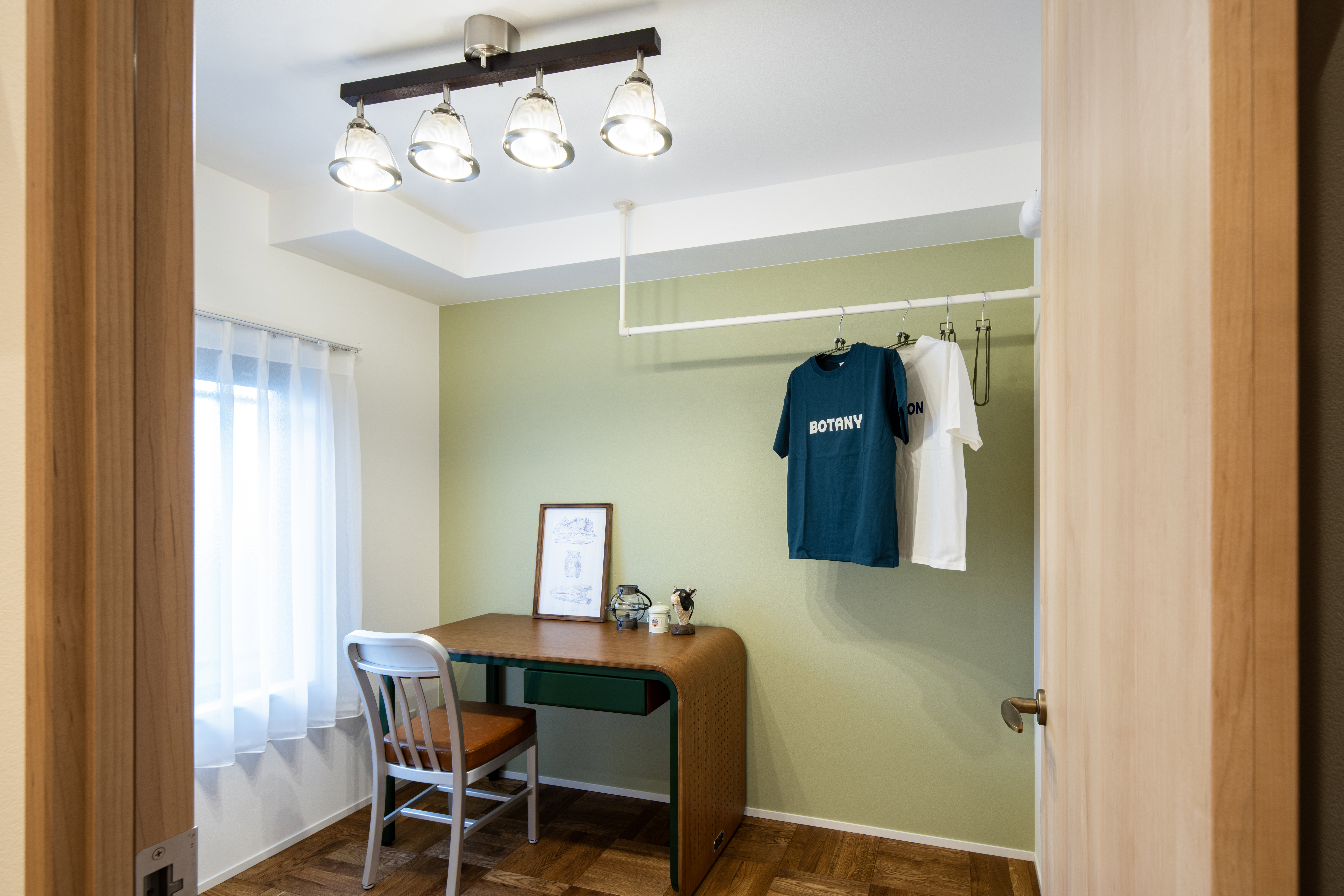 洋室は⽞関の室内窓越しに差し込むやさしい光が奥⾏きと繋がりを感じさせます。デスクはダイニングと同じダルトンの家具で統⼀感を持たせ、働く時間もくつろぐ時間も⾃分らしく楽しめる空間に仕上げました。