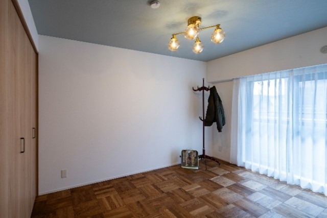 寝室は天井の淡いブルーグレーのアクセントクロスが空間に程よい温もりを添えます。天井にアクセントカラーを加えることで、空間に奥⾏きが⽣まれ、1⽇の終わりにほっと⼼が休まる雰囲気に。