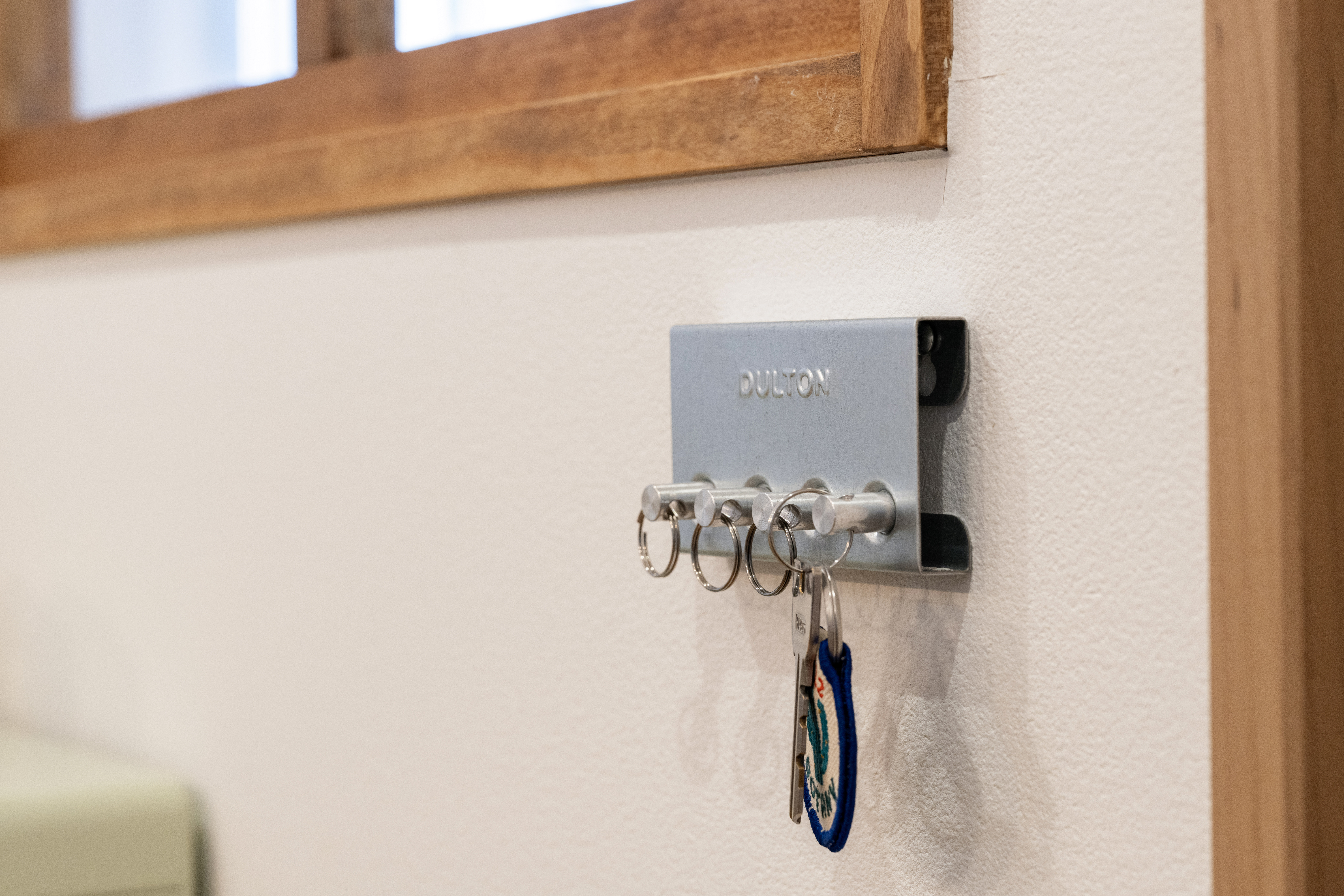 本物件では家具や雑貨を選ぶように、建材や小物によって遊び⼼あふれる空間をつくります。ダルトンのキーストレージや棚板に施したバー・ブラケット・ペーパーホルダーなど、細部にまで遊び⼼を取り⼊れることで、⽇々の暮らしにちょっとした楽しさをプラスします。