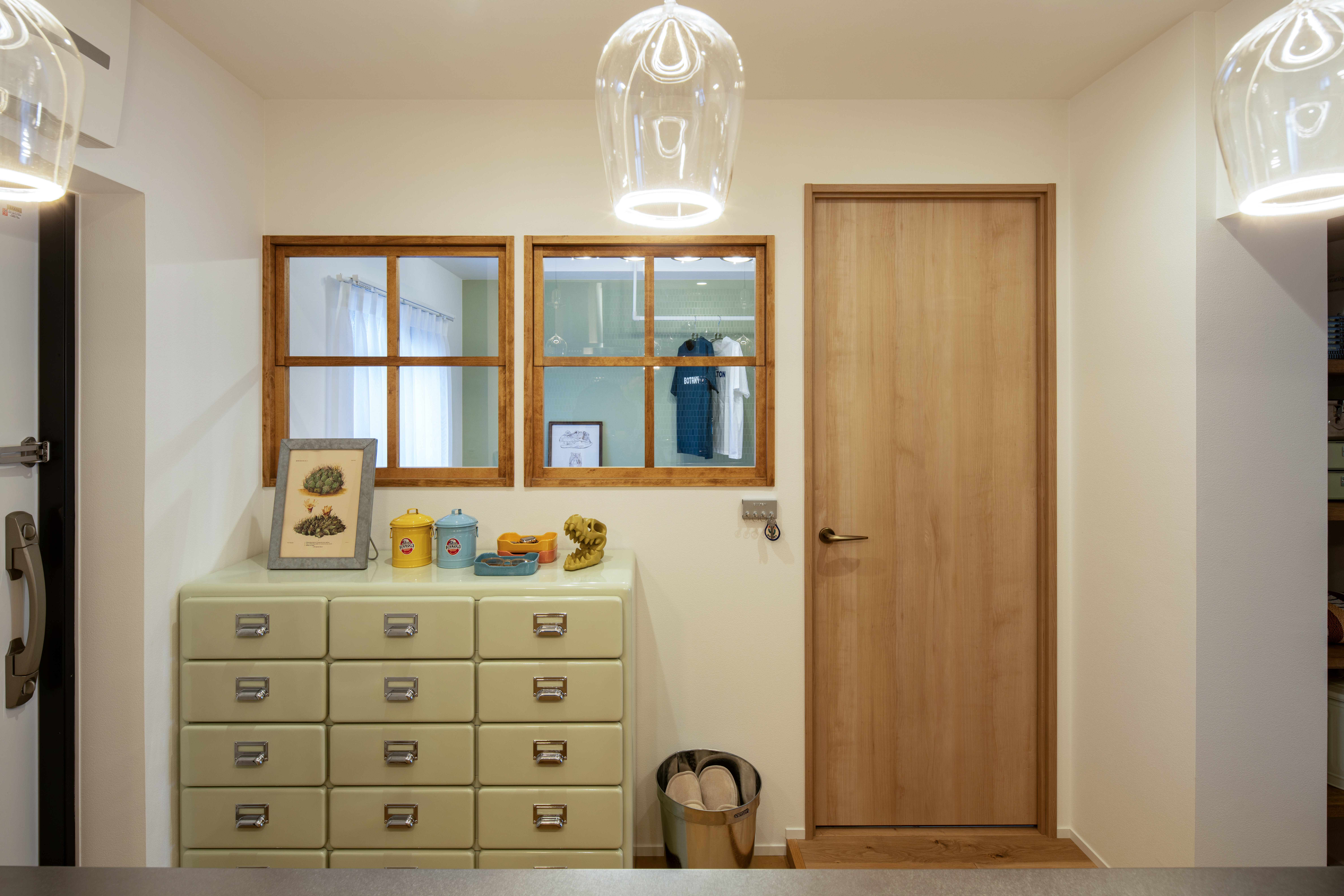 ウッドの室内窓が柔らかく光を通し、⽞関と洋室をゆるやかに繋ぎます。アールの効いたアイボリーのスチールドロワーを靴箱として活⽤。天板には、雑貨やアートを気ままにディスプレイし、「迎える場所」として楽しみます。⾒せる楽しさと隠す安⼼感を両⽴しながら、暮らしの始まりと終わりを軽やかに彩ります。