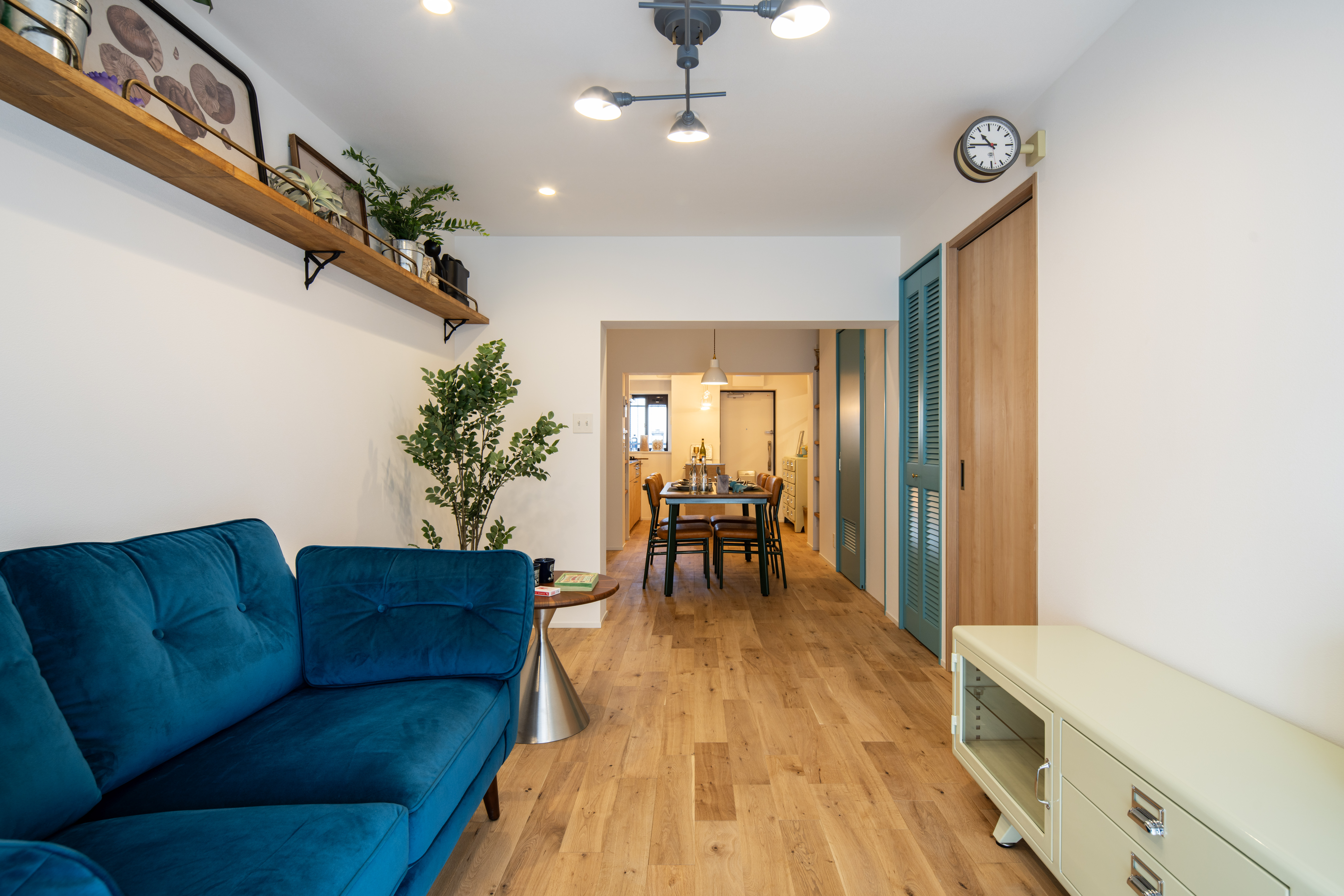 ふとした瞬間も絵になるような、ダルトンホームらしいリノベーションです。⽩を基調とした明るい空間に、ウッドの温もりとアイボリーの柔らかさが調和します。ブルーのアクセントカラーや雑貨で遊び⼼を添えながらも、全体は統⼀感のあるテイストに。