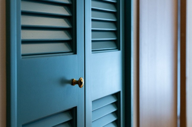 ブルーのベルベットソファに⾝をゆだね、プロジェクターで映画を楽しむ̶̶そんな穏やかな休⽇のひとときを過ごせます。太いラインで表現された⽂字盤が印象的な両⾯時計は、インテリアに雑貨のようなアクセントを添えます。リビング収納にはルーバーのクローゼットドアを採⽤。ルーバーと、グレイグリーンのカラーが軽やかで⼼地よい印象を与えます。
