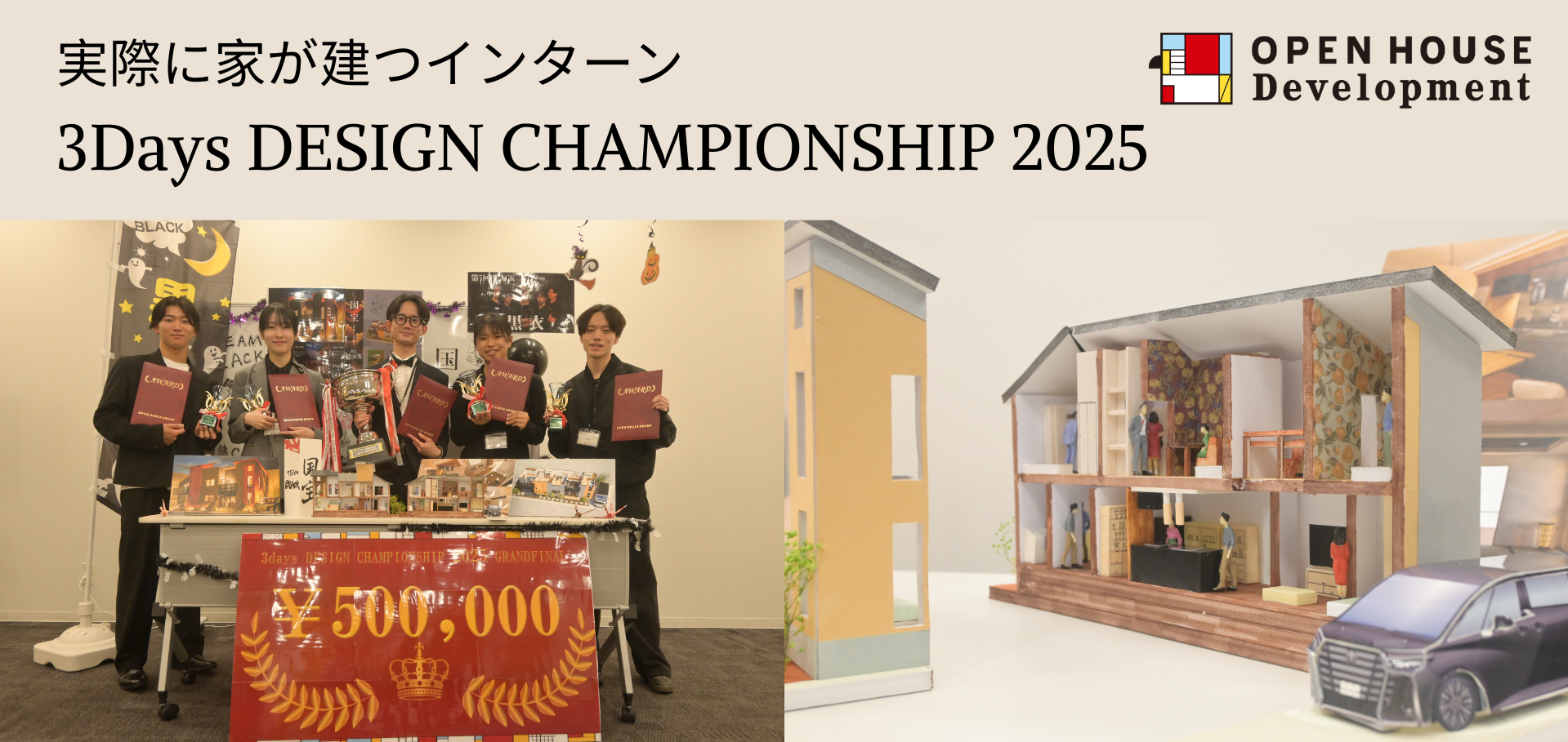 株式会社オープンハウスグループ(本社 東京都千代田区、代表取締役社長 福岡 良介、以下「当社」)のグループ会社である株式会社オープンハウス・ディベロップメント(本社 東京都千代田区、代表取締役 福岡良介)が毎年実施している、住環境や建築、土木、デザインを専攻する学生を対象にした、本当に建てる家を設計する超実践型のインターンシップ「3days DESIGN CHAMPIONSHIP 2025」のGRAND FINALが2025年10月21日に開催され、チーム「黒衣」の企画「国宝」が優勝しました。優勝チームには賞金50万円が贈呈され、設計プランはブラッシュアップののち、実際に建築・販売されます。