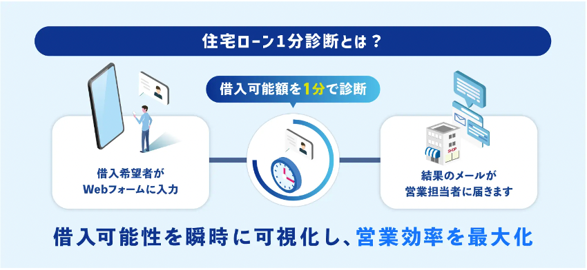 「住宅ローン1分診断サービス」は、信用情報機関のCICと金融機関の審査基準データベースをもとにした精度の高い診断により、住宅ローンの可否をわずか1分で判定できる、営業支援型のオンライン診断サービスです。