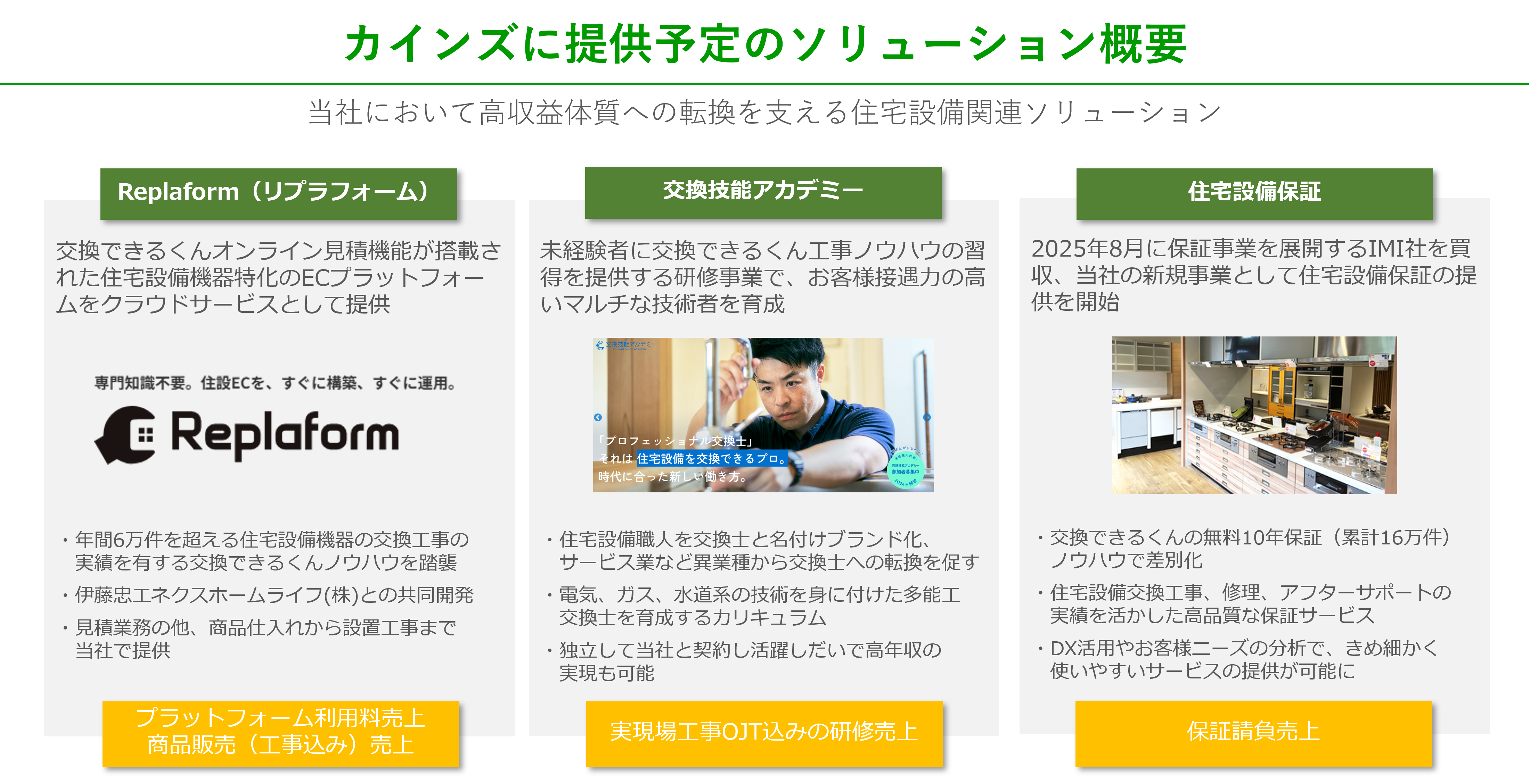 「スムーズに快適に利用できるリフォームサービス」の実現に向けて、まず、全国ブランドのカインズにおいて、当社が有するノウハウをソリューション化した「リプラフォーム」を活用して、住宅設備交換の事前訪問見積不要な販売方法を確立します。更に、当社から「住宅設備保証」の提供を受け、アフターサポートの充実でサービスの価値向上を図ります。