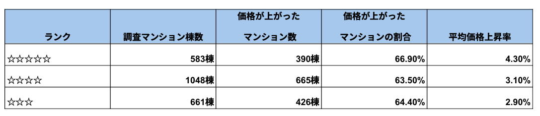 一方で、評価が星4つ、3つと下がるにつれて、価格上昇数の割合も上昇率も低下しています。