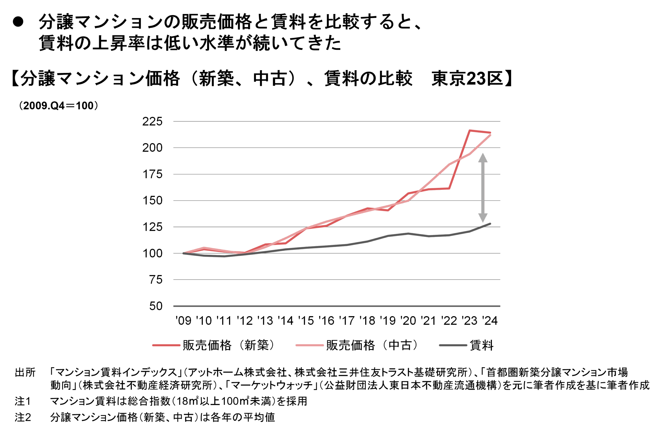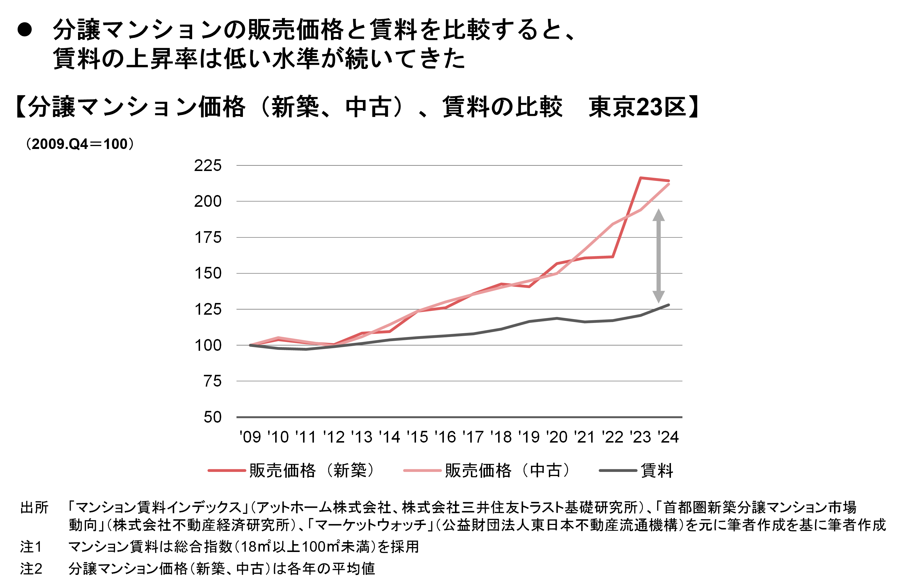 分譲マンションの販売価格と賃料を比較すると、賃料の上昇率は低い水準が続いてきた。投資市場で決定されるキャップレートの低下が要因の一つに挙げられる。