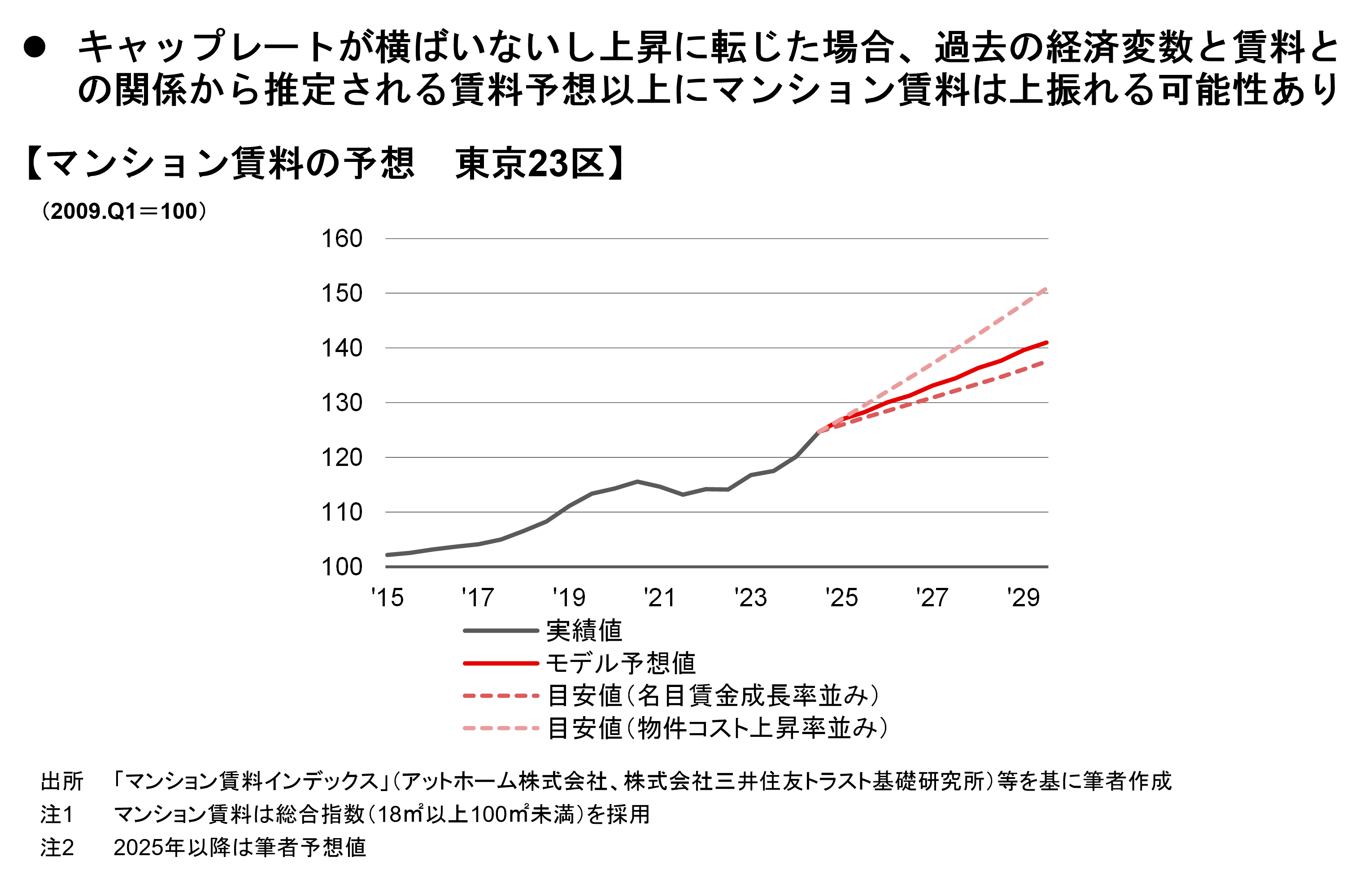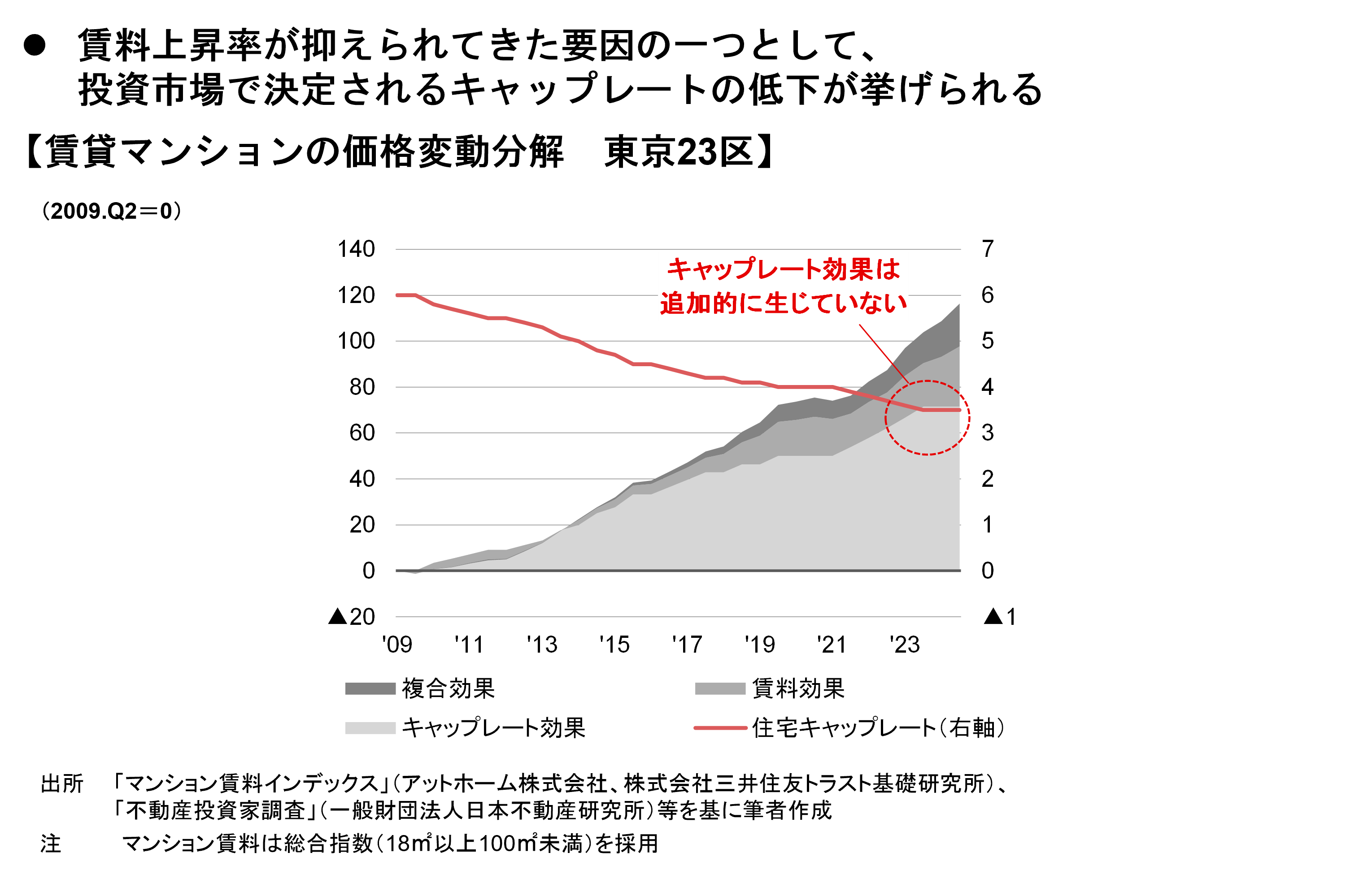 キャップレートが横ばいないし上昇に転じた場合、過去の経済変数と賃料との関係から推定される賃料予想以上にマンション賃料は上振れる可能性がある。