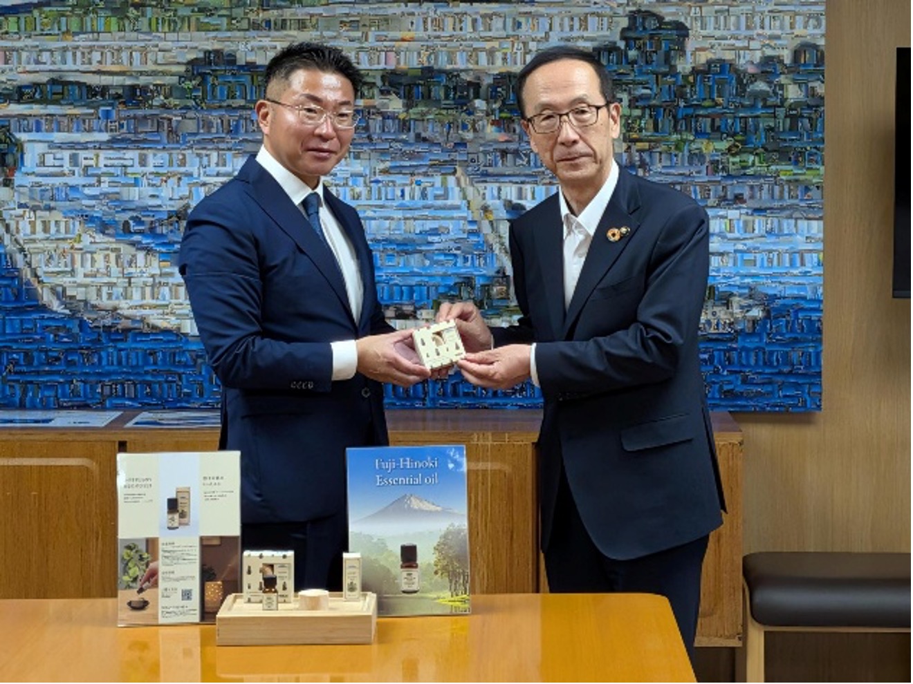 ノダでは、富士市に対して「ヒノキエッセンシャルオイル」と同じ材料(剥き芯)から生まれた「ウッドディフューザー」のセットを持参し、富士市・小長井義正市長への表敬訪問を実施。