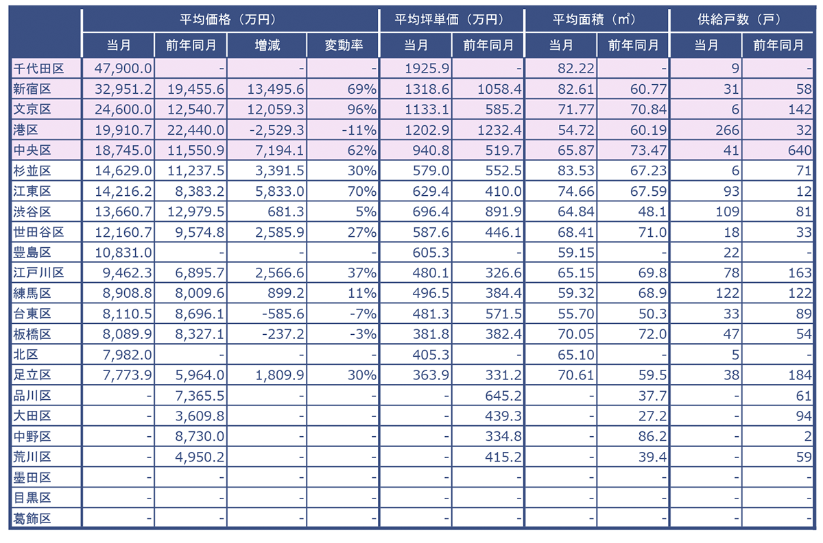 東京23区の各行政区毎に、平均価格、平均坪単価、平均面積、供給戸数をまとめました。当月の平均価格が大きい順に表示しています。
