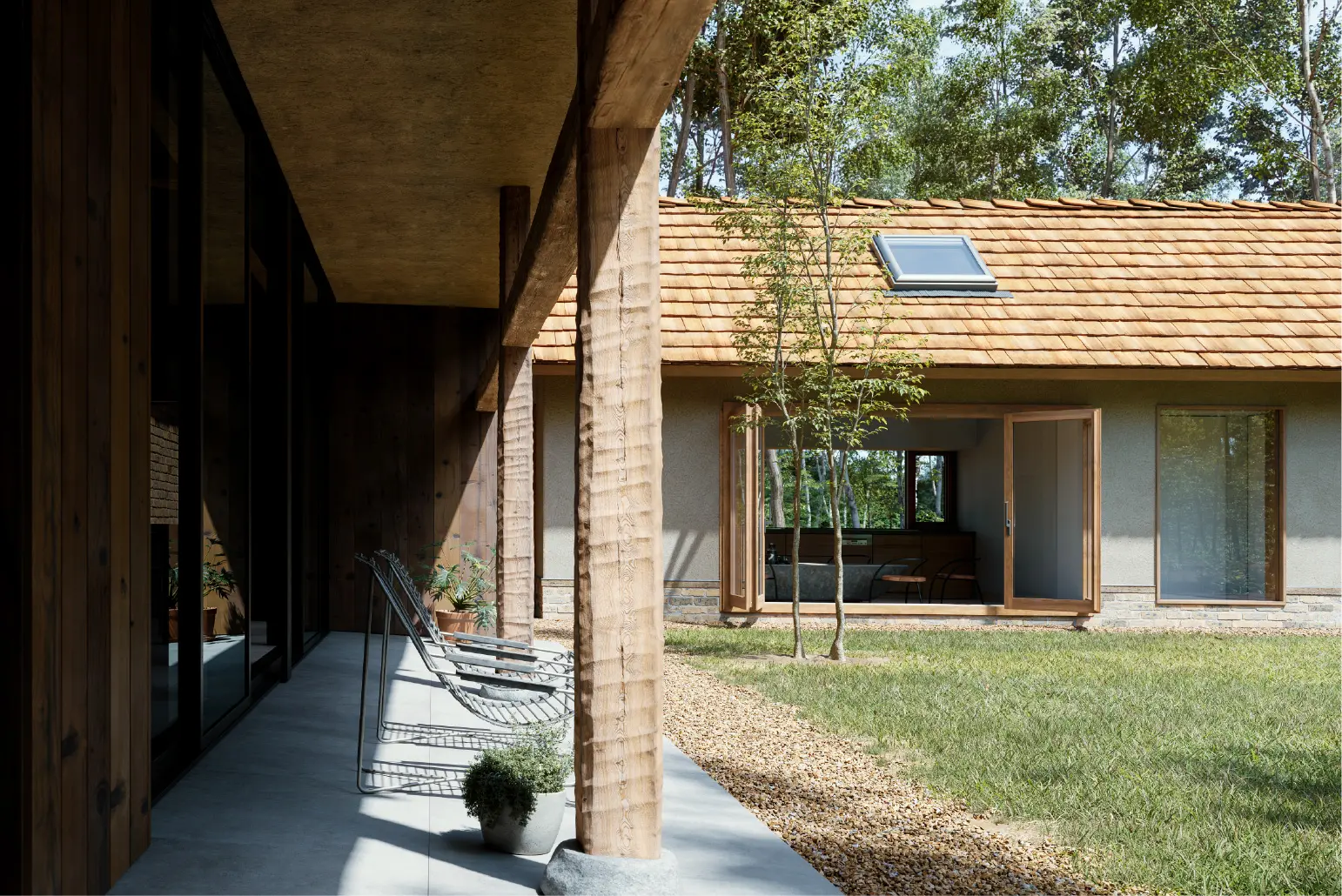 森と調和する木の構造体は、伝統的なティンバーフレーム工法を継承しつつ、日本建築の象徴でもある丸柱を採用。また、太い丸太(ティンバー)で組み上げた骨格(フレーム)には国産栗材を使用。力強い佇まい。断熱性・最新設備も備えた“未来へと受け継がれる住まい”です。