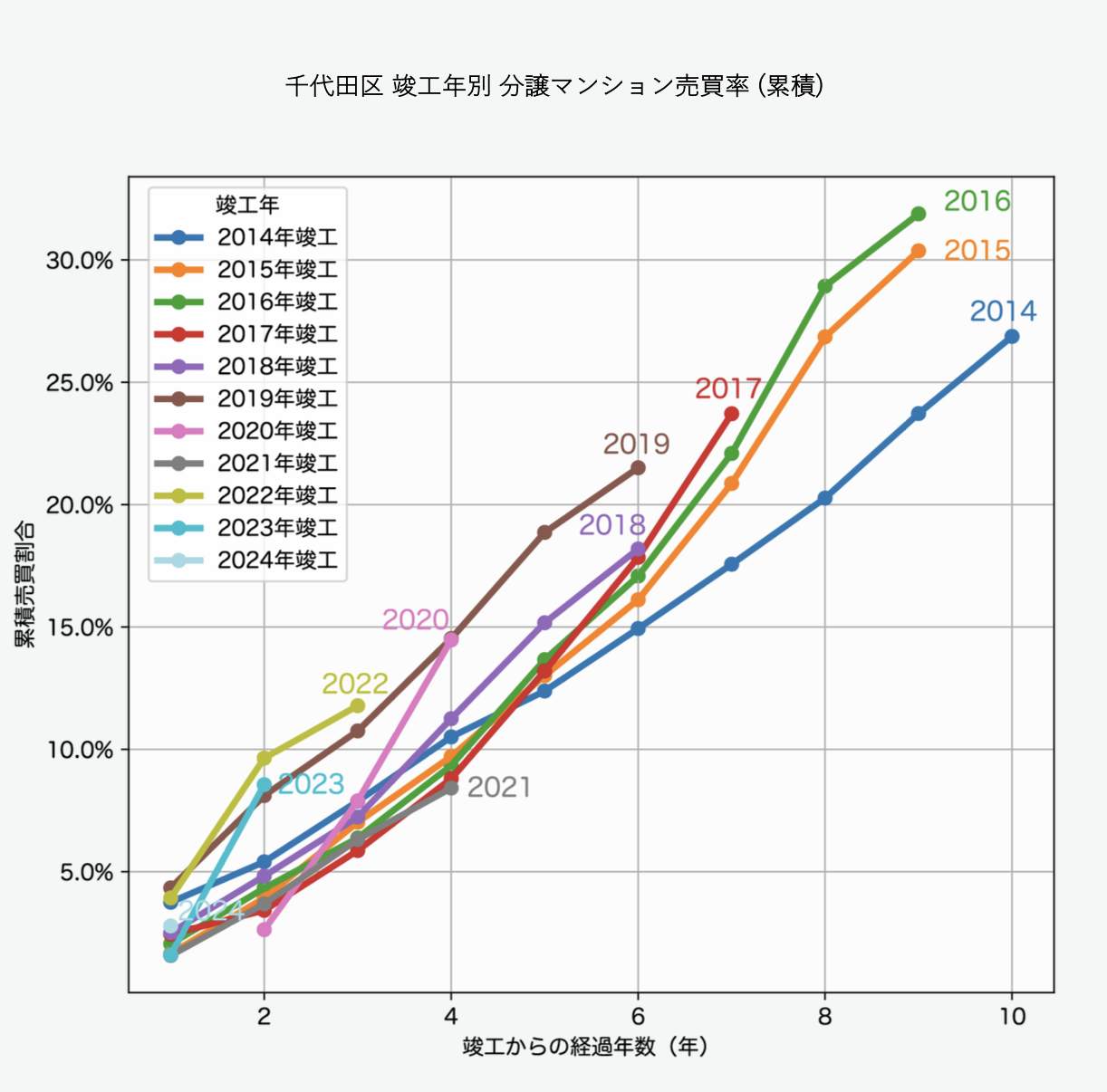 竣工からの経過年数で比較すると、千代田区では、築年が浅い物件ほど総戸数に対する累積売買率が高い傾向が見られました。これは、近年竣工した物件において、早期の所有権移転を伴う取引が活発化していることを示しています。