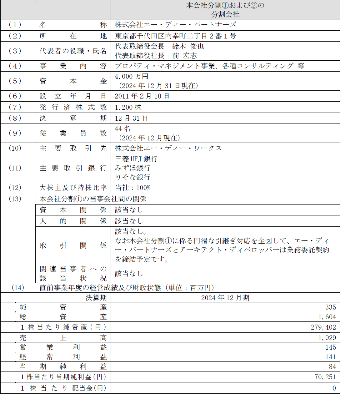 当社の連結子会社である株式会社エー・ディー・パートナーズ(以下、「エー・ディー・パートナーズ」)は 2025年11月25日開催の取締役会において、2026年1月13日を効力発生日として「外部オーナー向けプロパティマネジメント事業」を、吸収分割(以下、「本会社分割①」)により株式会社アーキテクト・ディベロッパー(以下、「アーキテクト・ディベロッパー」)に対して承継することを決議しましたので、お知らせします。 また、本会社分割①の効力発生日と同日付で、エー・ディー・パートナーズの「当社グループが保有する物件に対するプロパティマネジメント事業」「当社グループが不動産小口化商品として売却した物件に対するプロパティマネジメント事業」「医療モール マスターリース・サブリース事業」「賃貸保証事業」を、吸収分割(以下、「本会社分割②」といい、本会社分割①と総称して「本会社分割」という)により、当社の連結子会社である株式会社エー・ディー・ワークス(以下、「エー・ディー・ワークス」)に対して承継することを決議しましたので、併せてお知らせいたします。 なお、本会社分割①は、当社の連結子会社を分割会社とする吸収分割であるため、開示事項・内容を一部省略しています。また、本会社分割②は、当社の連結子会社同士による吸収分割であり、適時開示基準に該当しませんが、当社のグループ経営における戦略等を理解する上で有益な情報と判断し、任意開示を行うものです。