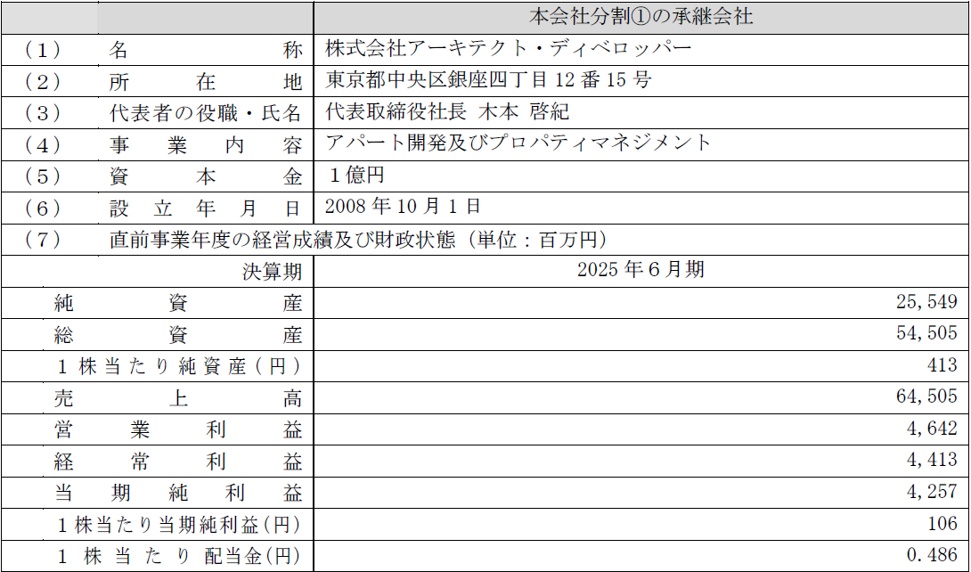 本会社分割①により、承継会社のアーキテクト・ディベロッパーは、会社分割効力発生日におけるエー・ディー・パートナーズの「外部オーナー向けプロパティマネジメント事業」に関する資産、負債、契約上の地位、その他の権利義務について、吸収分割契約書に定めたものを承継します。