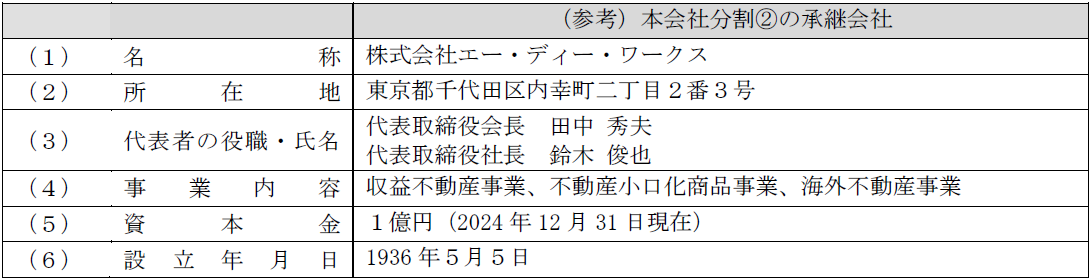 本会社分割②により、承継会社のエー・ディー・ワークスは、会社分割効力発生日におけるエー・ディー・パートナーズの「当社グループが保有する物件に対するプロパティマネジメント事業」「当社グループが不動産小口化商品として売却した物件に対するプロパティマネジメント事業」「医療モール マスターリース・サブリース事業」「賃貸保証事業」に関する資産、負債、契約上の地位、その他の権利義務について、吸収分割契約書に定めたものを承継します。