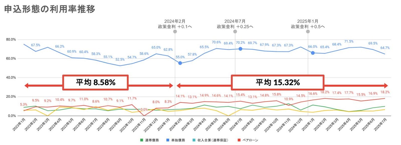この変化を最も象徴するのが、ペアローンの利用率の急上昇です。レポート期間中、ペアローンはなんと約8.6倍という圧倒的な成長を遂げました。この事実は、共働き世帯を中心に、金利の不確実性が高まる中で、夫婦で協力し、返済リスクを分かち合おうとする新しい消費者の姿を物語っています。