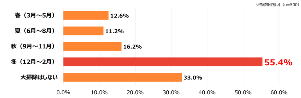 大掃除を行う時期について尋ねたところ、年末年始にあたる「冬(12月〜2月)」と回答した人が55.4%で最も多く、半数を超える結果となりました。次いで「秋(9月〜11月)」が16.2%、「春(3月〜5月)」が12.6%、「夏(6月〜8月)」が11.2%と続きました。一方で、「大掃除はしない」と回答した人も33.0%にのぼり、3人に1人は大掃除の習慣がないことがわかりました。