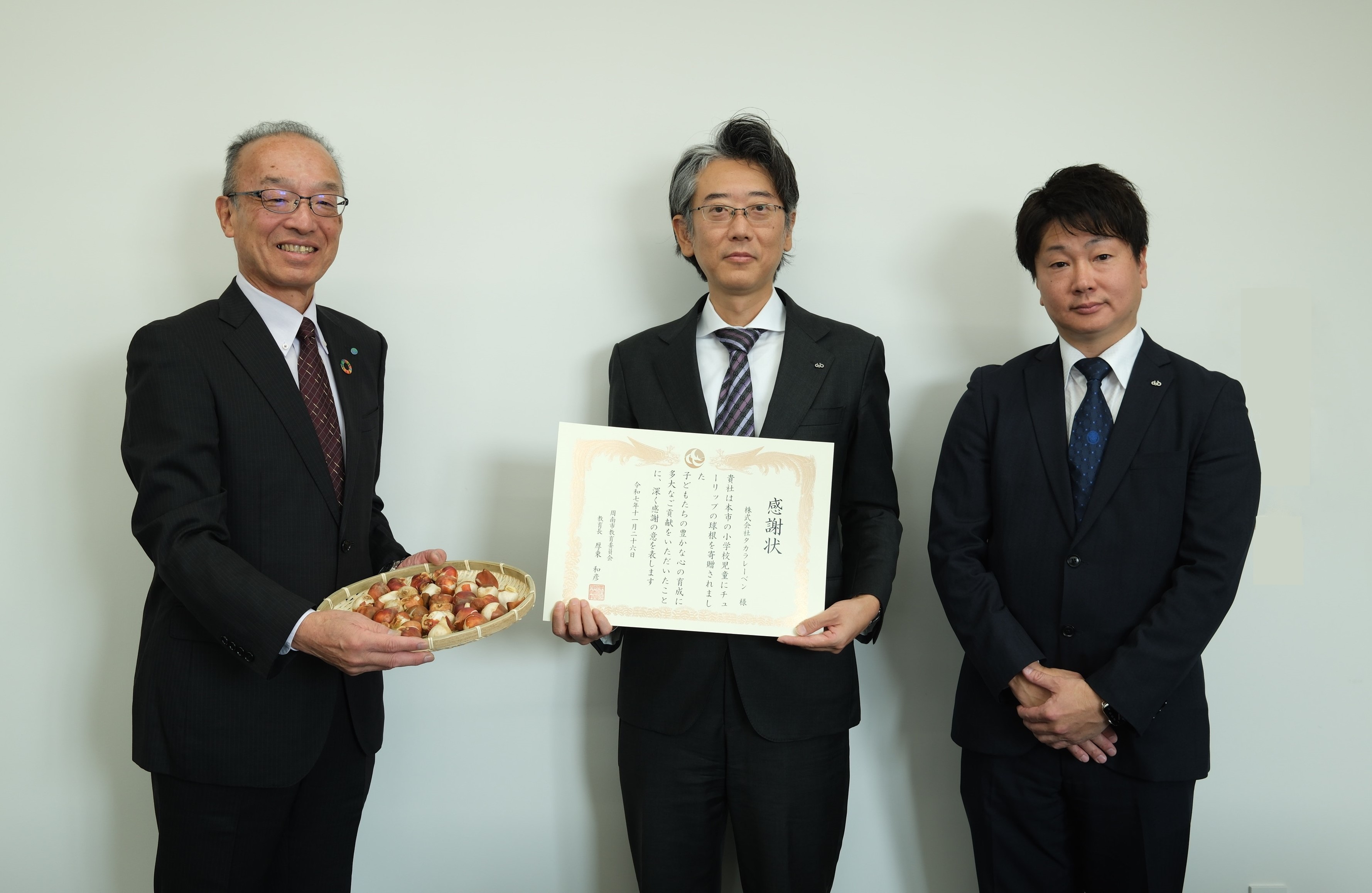 感謝状贈呈式は、11月26日に周南市役所で執り行われました。当社からは、上席執行役員 マンション事業本部 西日本支社長 兼 営業推進事業部長 水野 公平が出席し、周南市教育委員会 教育長 厚東 和彦様へ目録とチューリップ球根を贈呈し、感謝状を拝受しました。