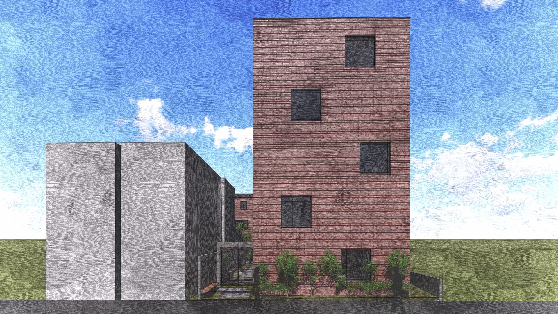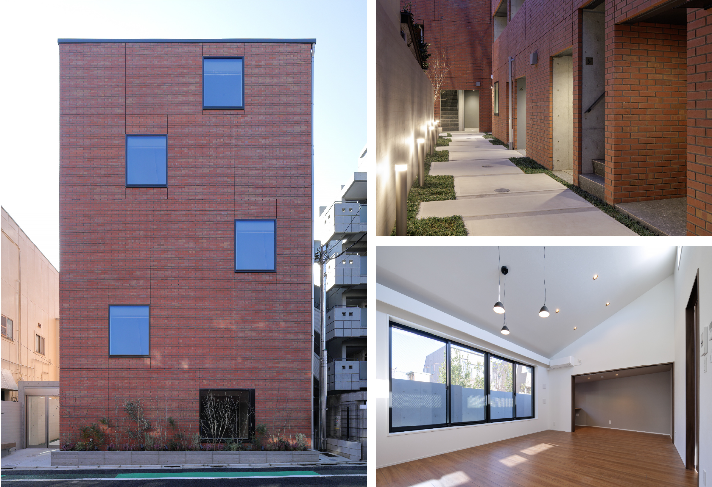 計画地は閑静な住宅街に囲まれているため、周囲の環境に調和する建物を模索しました。ファサードはシンプルな長方形とし、街並みに馴染む形態を採用しています。また、外壁にはレンガ調のタイルを使用することで、街と調和しつつも温かみのある雰囲気を演出いたしました。