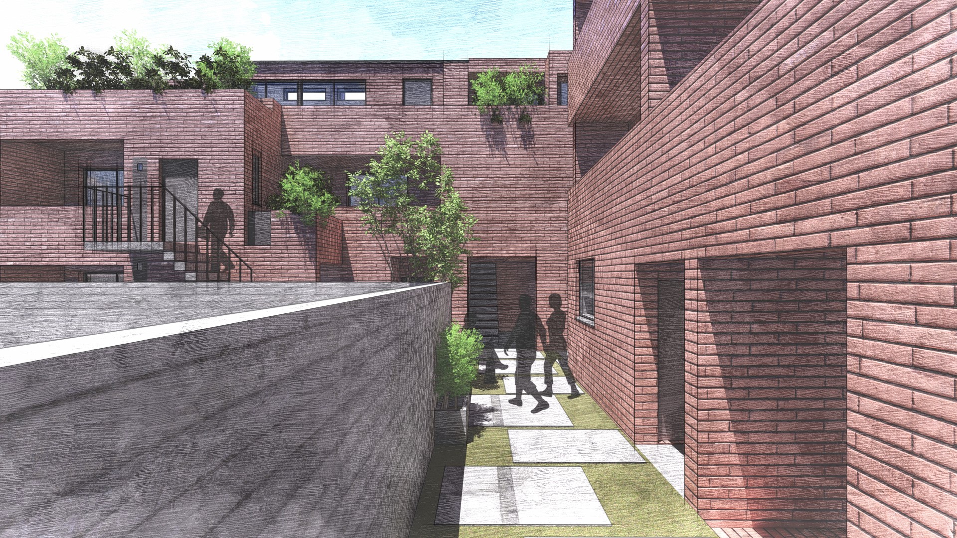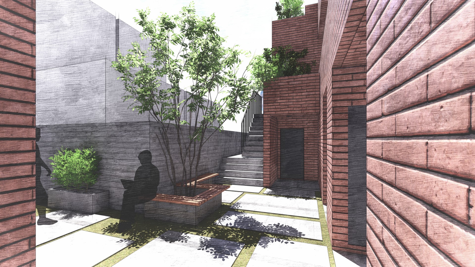 住居人の共用の庭として、敷地の中心に公園のような空間を計画いたしました。共用の庭を敷地の中心に配置することで、各住戸からの動線が短くなり、気軽に立ち寄れる憩いの場となります。また、植栽を囲むようにベンチを配置し、住人が自然を身近に感じながらリラックスできる空間づくりを目指しました。