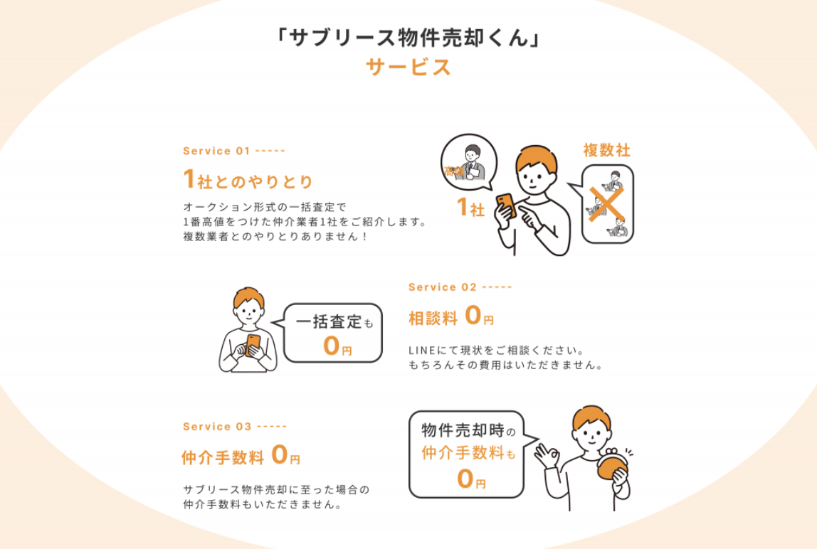 物件オーナー様からの相談や一括査定は無料。さらに売却時の仲介手数料も無料です。「サブリース物件売却くん」なら「売りたいけれど買い手が見つからず売れない」という状況を回避できます。