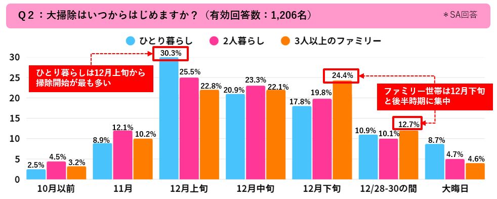 大掃除の開始時期として最も多かったのは「12月上旬」という結果に。世帯によって開始時期に違いが見られ、ひとり暮らしは12月上旬が最も多い一方、ファミリー世帯では12月下旬〜大晦日3日前迄の期間に集中する傾向が分かります。ひとり暮らしでは、帰省や旅行など年末の予定に向けて早めに大掃除を済ませる人が多いのに対して、ファミリー世帯では、子どもの冬休み開始や家族全員が休みに入る時期に合わせて後半にまとまって取り組む傾向があると推測されます。また、大晦日に大掃除をする“年末ギリギリ派”は、ひとり暮らしが1割弱と比較的高くなっています。これは、年末まで忙しく掃除の時間が取れない人が多いことや、帰省しないひとり暮らしの場合は大晦日にまとまった作業時間を確保しやすいことなどが予想されます。