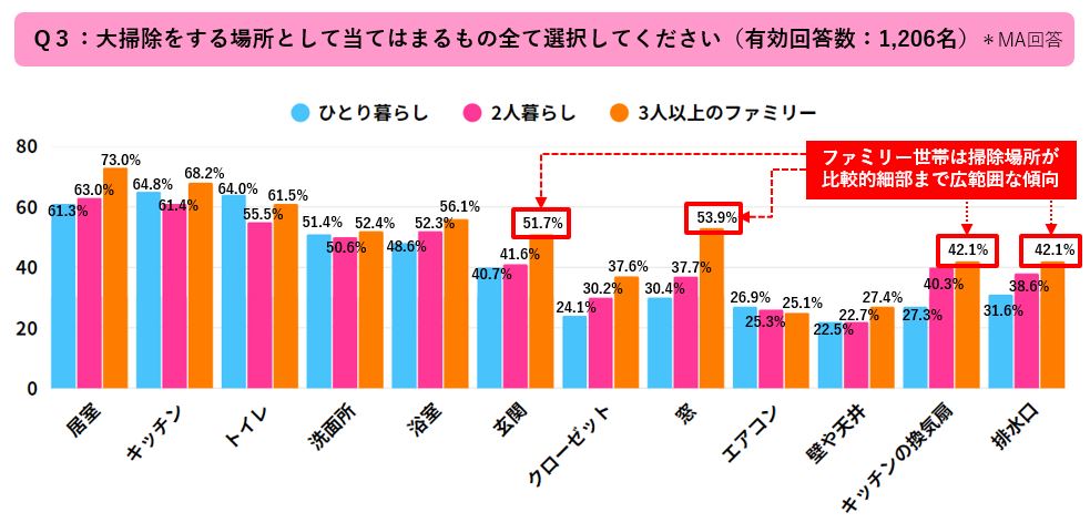 すべての世帯で、居室・キッチン・トイレは掃除する人が多い一方、クローゼットや窓、キッチンの換気扇や排水口といった手間のかかる場所ではファミリー世帯は掃除する人が多いものの、ひとり暮らしでは比較的低い傾向が分かります。質問1の結果で、ひとり暮らしは「しっかり掃除派」が多かったですが、必要最低限の場所を徹底して掃除する一方で、目に入らないような場所は掃除をしないという意識もうかがえます。対してファミリー世帯では、汚れやすく時間のかかる場所も積極的に掃除をする割合が高く、家族で分担しながら念入りに掃除を進めている様子がうかがえます。ひとり暮らしでは、限られた時間のなかで“自分ひとりでできる範囲”を優先して掃除するという意識も推察されます。