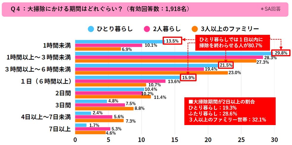 大掃除の期間として最も多かったのは1時間以上~3時間未満で、すべての世帯の3割弱の回答となりました。特にひとり暮らしでは、6時間未満と回答した割合が64.8%、1日以内では80.7%と大半の人は1日で大掃除を終わらせていることが分かります。対して、2日以上かけている割合では、2人暮らしが28.6%、3人以上のファミリー世帯では32.1%と高い傾向になり、複数世帯の方が2日以上にわたり掃除をしていることが分かります。