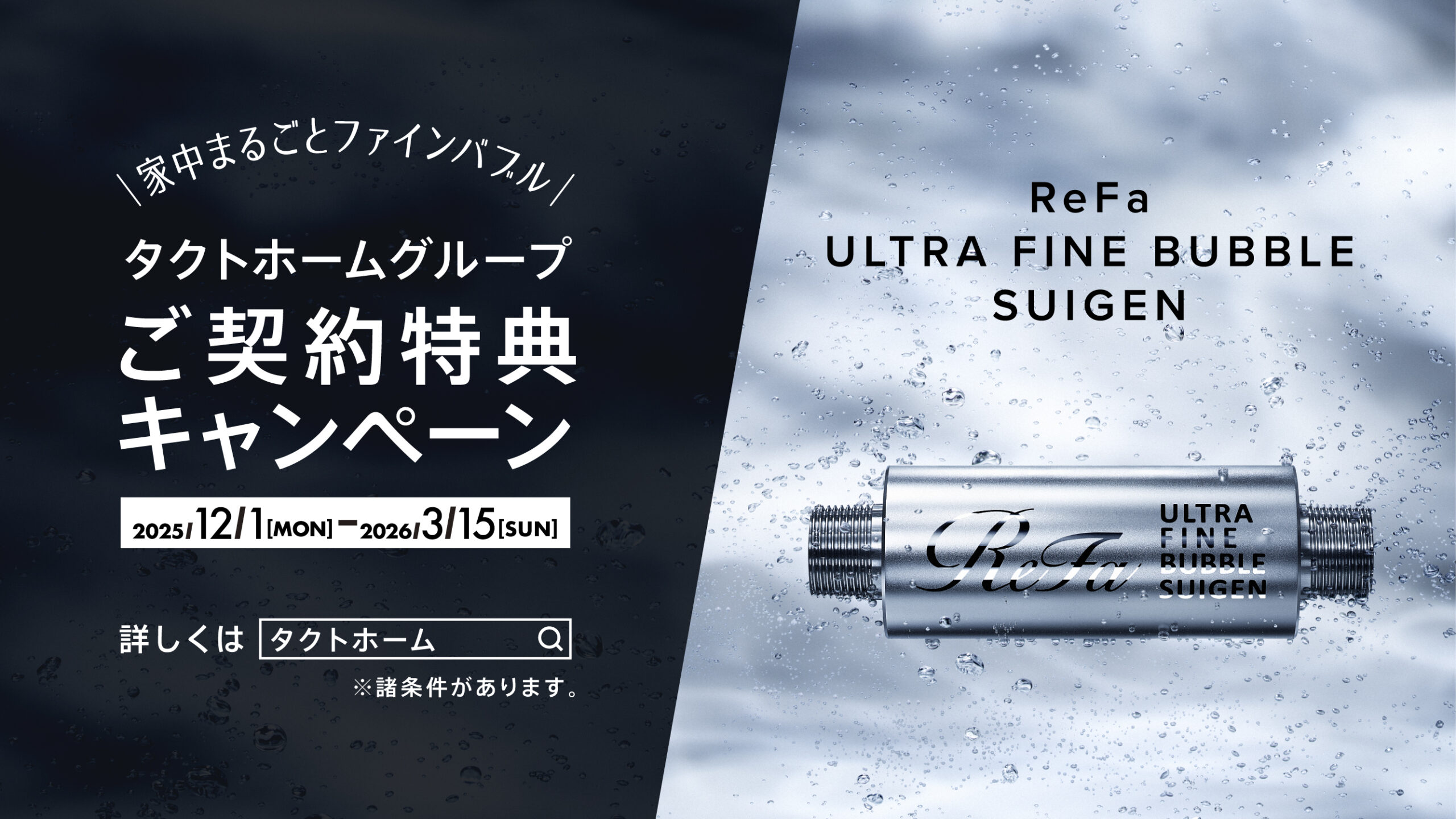 タクトホーム株式会社(本社:東京都西東京市、代表取締役社長:小寺一裕)は2025年12月1日(月)~2026年3月15日(日)まで、タクトホームグループの新築一戸建てをご成約いただいた方を対象に、「ReFa ULTRA FINE BUBBLE SUIGEN」を特典として設置する「家中まるごとファインバブルキャンペーン」を実施します。