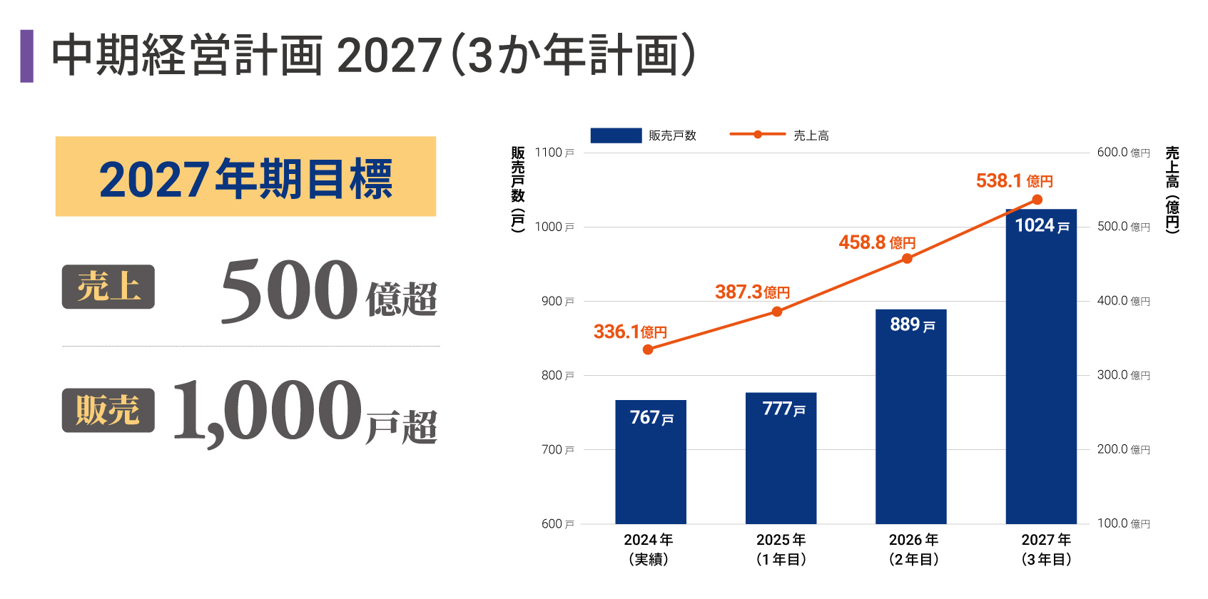 中期経営計画の1年目となる2025年11月期は売上高・約410億円、販売戸数・約790戸と、中計目標の387.3億円、777戸を達成する見込みです。新宿支店開設により売れ筋物件の買取を拡充し、2027年の目標である売上高538.1億円・販売戸数1,024戸達成を目指します。