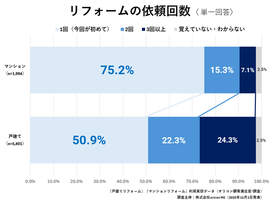 一方、戸建てリフォームでは、「2回」が22.3%、「3回以上」が24.3%で複数回リフォームを行っている依頼者が計46.6%と約半数を占めており、マンションに比べてリピーターが多いことが分かりました。