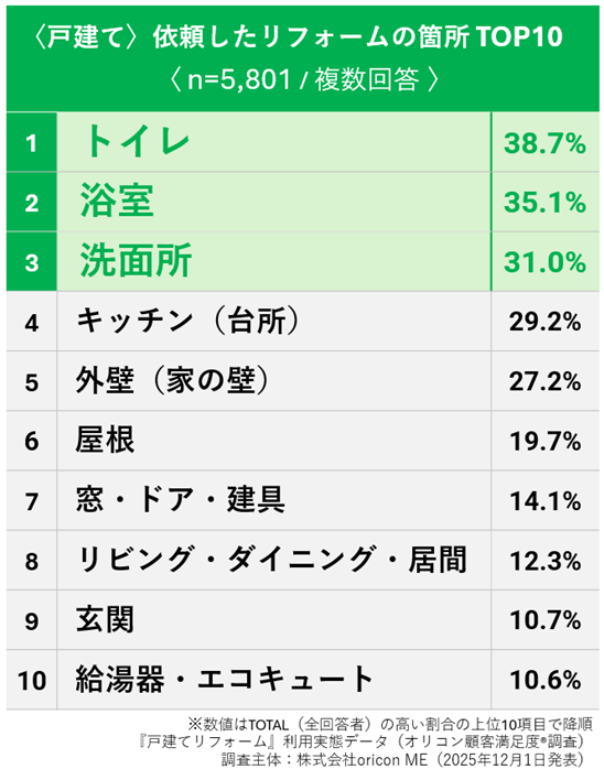・『マンション』『戸建て』ともに「トイレ」が最多 『フルリフォーム』では「キッチン(台所)」が最多に