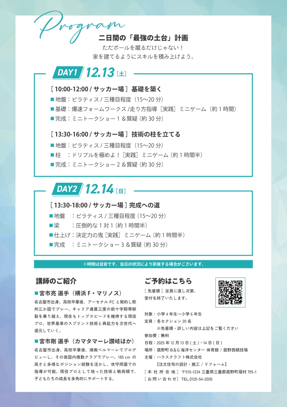 本イベントでは、一過性のイベントではなく、「人生」「家族」「挑戦」「再生」「未来」を子供達に届ける物語型のスクールです。宮市選手のキャリアを「家づくりのプロセス」に重ね合わせた独自のプログラムを用意。身体=地盤、走力=基礎、技術=柱、戦術=梁、決定力=仕上げ と段階的に積み上げていく構成とし、サッカーを通じて「人生も積み重ねでつくられる」ことを体験いただきます。