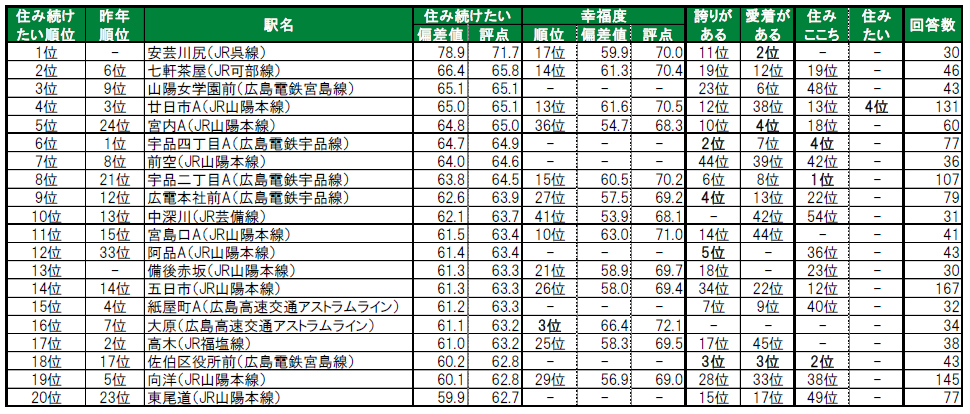 呉市に位置する安芸川尻が、唯一偏差値70台の高い評価を得て、初登場で1位に輝きました。安芸川尻は、昨年は累計回答数が30名未満でランキング集計対象外でした。2位は広島市安佐南区に位置する七軒茶屋(昨年6位)、3位は廿日市市に位置する山陽女学園前(昨年9位)で、いずれも昨年より順位を上げてトップ3入りしています。その他昨年より大きく順位を上げてトップ10入りしたのは、5位宮内A(昨年24位)、8位宇品二丁目A(昨年21位)です。