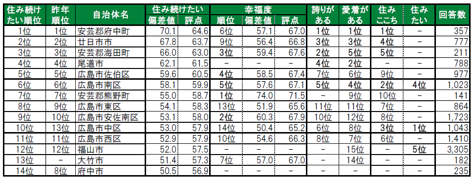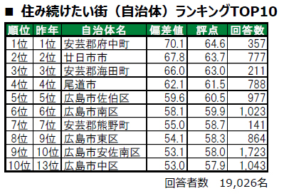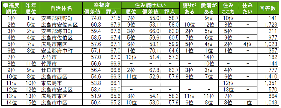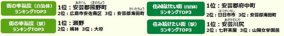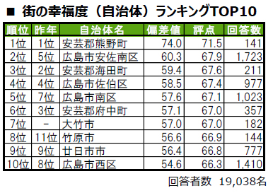 ■街の幸福度(自治体)トップは、2年連続で安芸郡熊野町