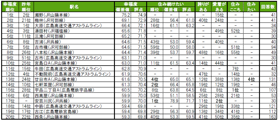 1位は広島市安芸区に位置する瀬野で、唯一偏差値70台の高い評価を得ています。2位は梅林で、昨年21位から大きく順位を上げました。3位は大原で、2位と3位は広島市安佐南区に位置する駅という結果になっています。その他トップ10内では、8位八本松(昨年26位)、9位古市(昨年51位)、10位宮島口A(昨年25位)が、昨年より特に順位を上げてトップ10入りしています。