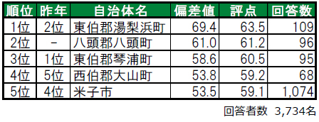 唯一偏差値70台の高い評価を得た東伯郡湯梨浜町が、今年は1位に輝きました。東伯郡湯梨浜町は、「誇りがある」「住みここち」など複数の項目で1位の高い評価を得ている街です。2位は、西伯郡伯耆町です。3位は東伯郡北栄町、4位は八頭郡八頭町(やずぐん やずちょう)で、いずれも昨年は偏差値50未満のため順位非公開だった自治体です。今年のトップ4は、郡部に属する「町」という結果になっています。