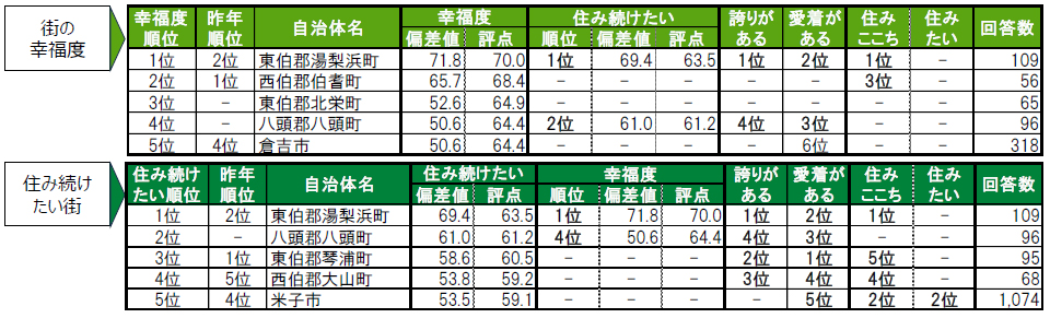 ※幸福度・住み続けたい街・街に誇りがある・街に愛着があるの項目で順位が「-」と表示されている場合は、偏差値50未満を意味します。