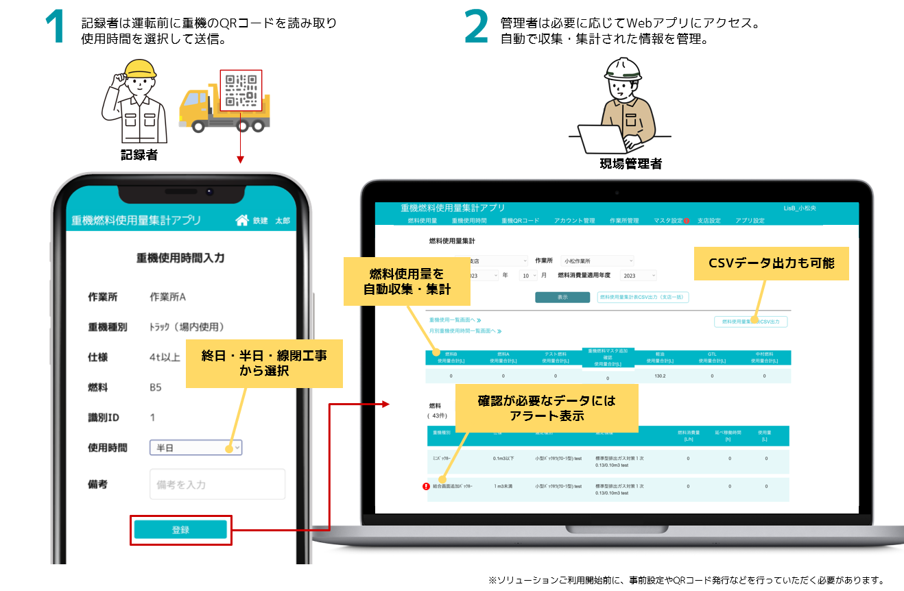 Scope1 排出量(主にCO₂)集計の効率化と高度化 Scope1排出量の計算に用いる重機による燃料使用量を、スマートフォンと重機情報の入ったQRコードを活用して集計することで、Scope1排出量集計の効率化と高度化をめざしています。