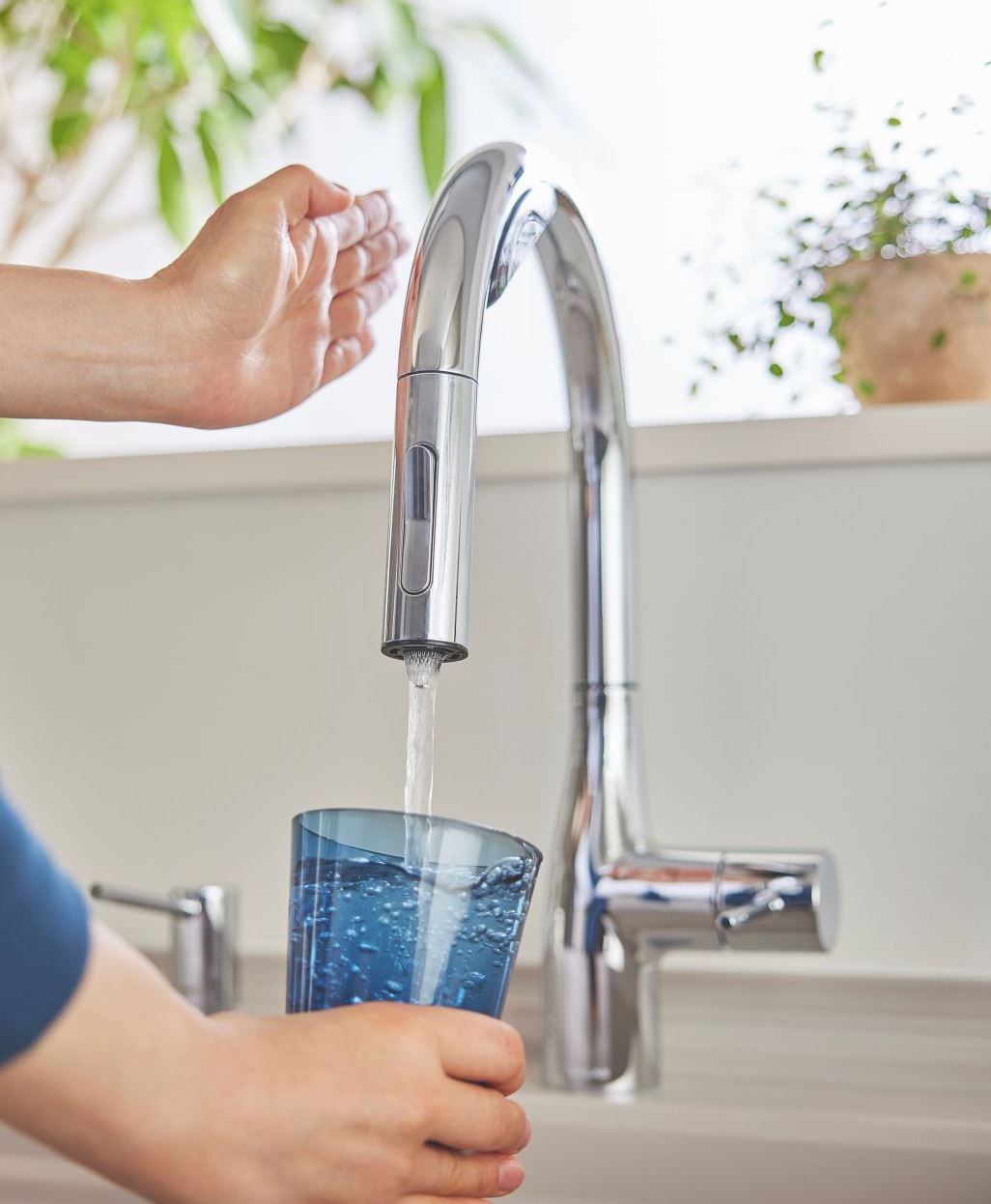 当社製の水栓一体型浄水器「エルタス」シリーズで初めて、曲線が美しいグースネックデザインを採用。さらに、左右に付いている2つのセンサーで、水道水と浄水それぞれを本体に触れずに吐水できるWセンサー機能も新規搭載しました。付属の浄水カートリッジはPFOS及びPFOAを含む17+5物質※を除去可能。ミネラル分は残したまま、美味しくキレイな水を作ります。