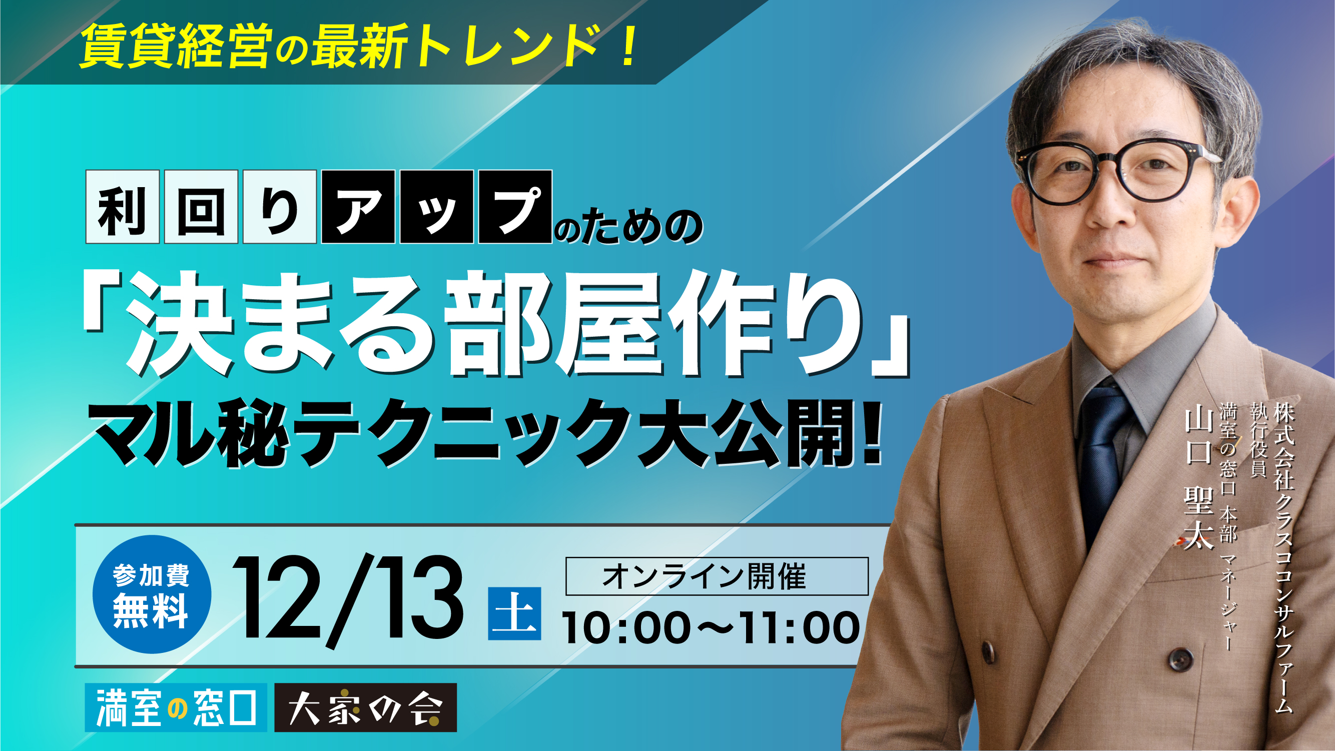 不動産オーナー向けセミナー「賃貸経営の最新トレンド!利回りアップのための「決まる部屋作り」のマル秘テクニック大公開!」12/13(土)オンライン開催