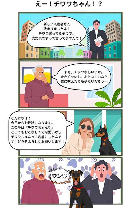 “チワワちゃんという名前のドーベルマン”がやってきた――という〝漫画のような本当の話〟も起きています(※当社4コマより)。