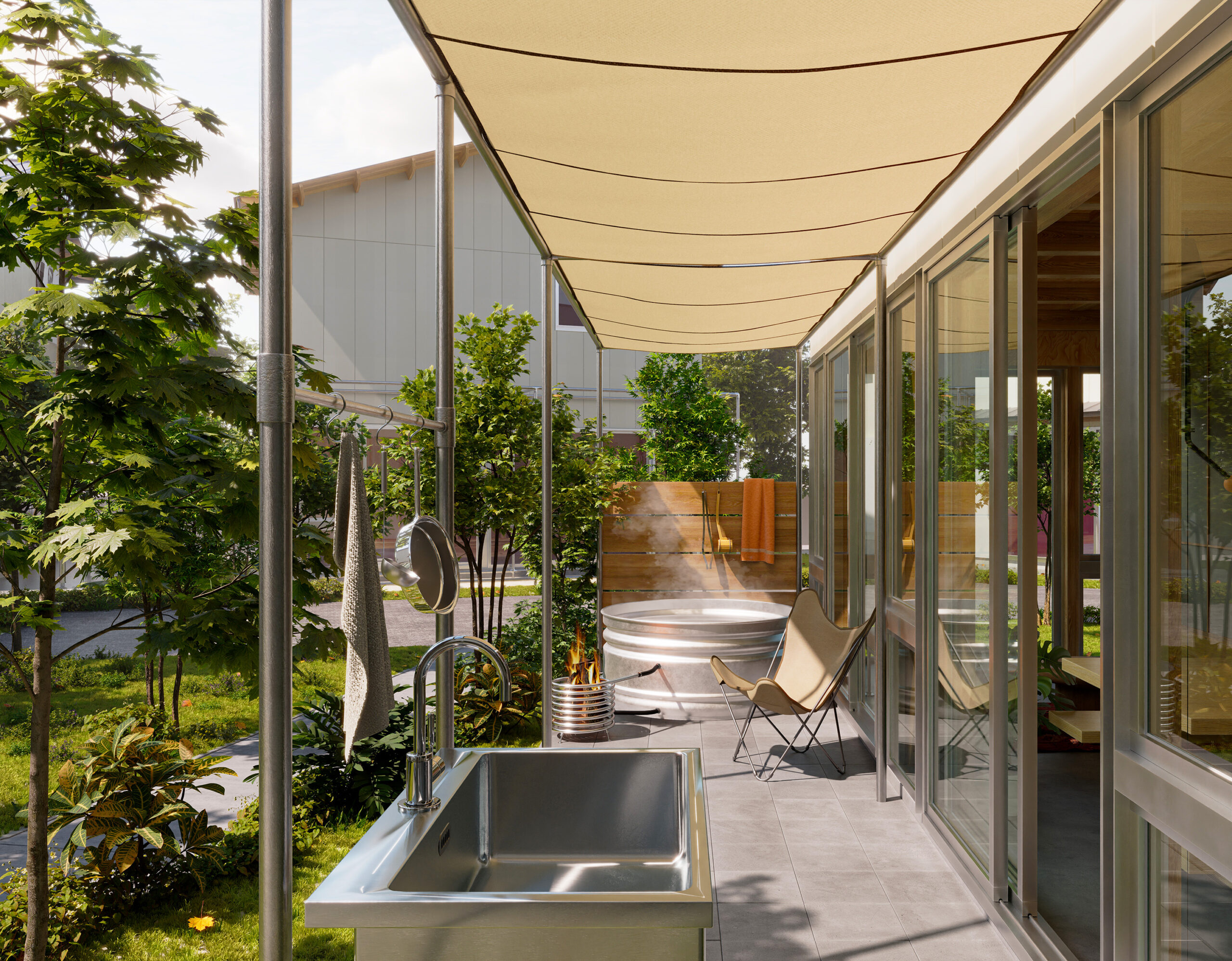 シンクやバスタブを置けるオプションで、プールや露天風呂、バーベキューなども日常的に楽しめる