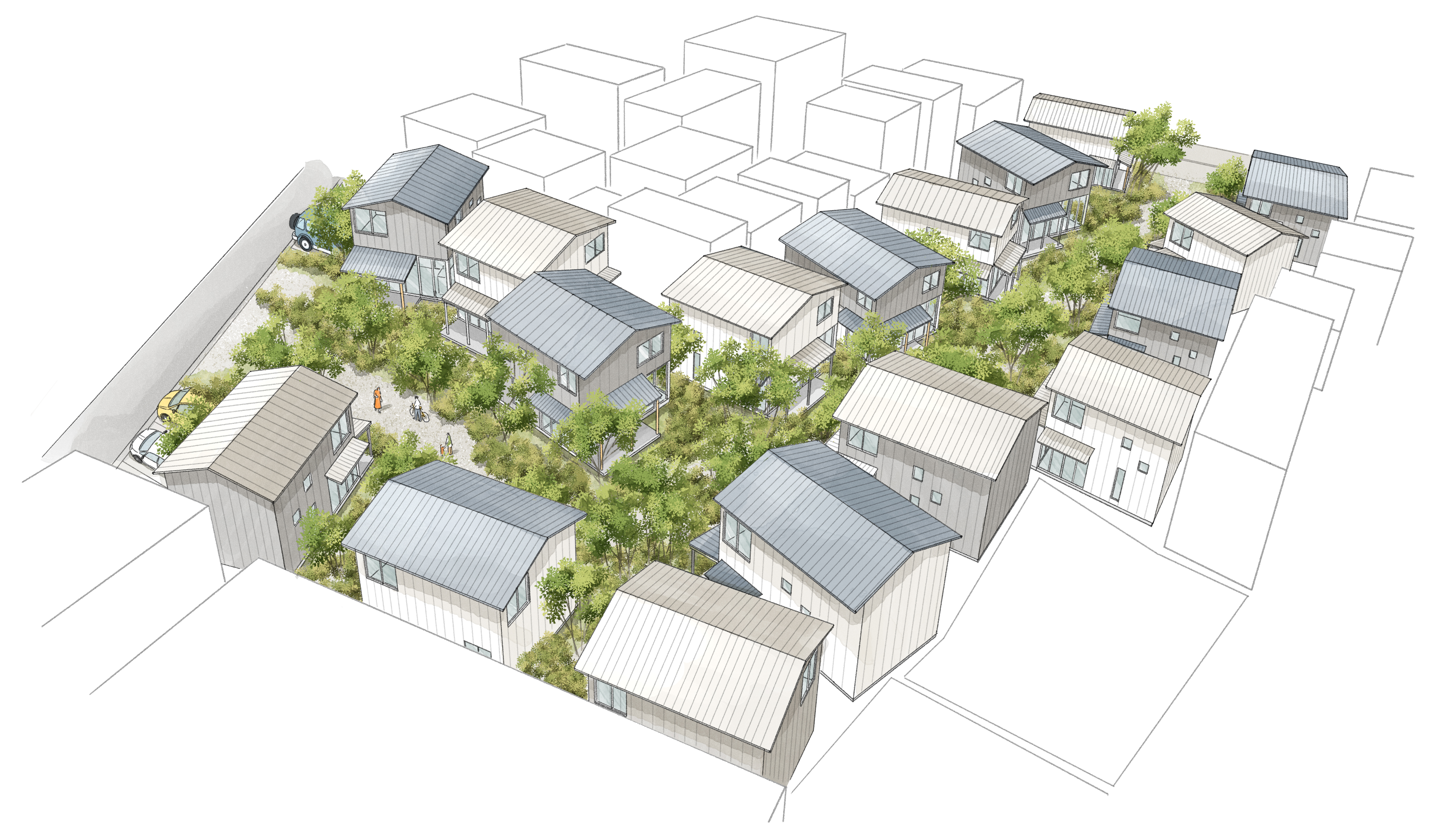 ここに、17棟の新築戸建が集まる住宅地をつくります。ただ家が並ぶのではなく、大きな庭のように緑地を共有する環境をつくることで、のびのびとした暮らしを育みます。