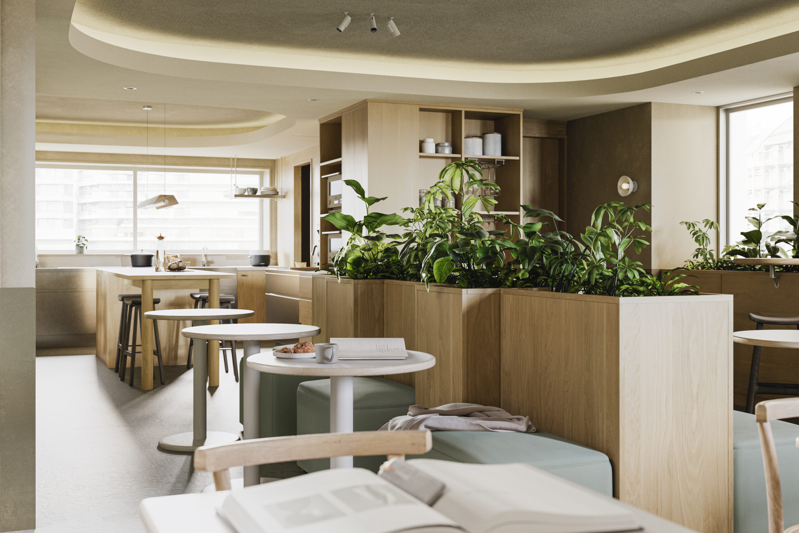 食事や仕事、ちょっとした作業から談笑まで、さまざまな時間を心地よく過ごせます。中央のソファ席は植物によってプライバシーが保たれるよう配慮しました。