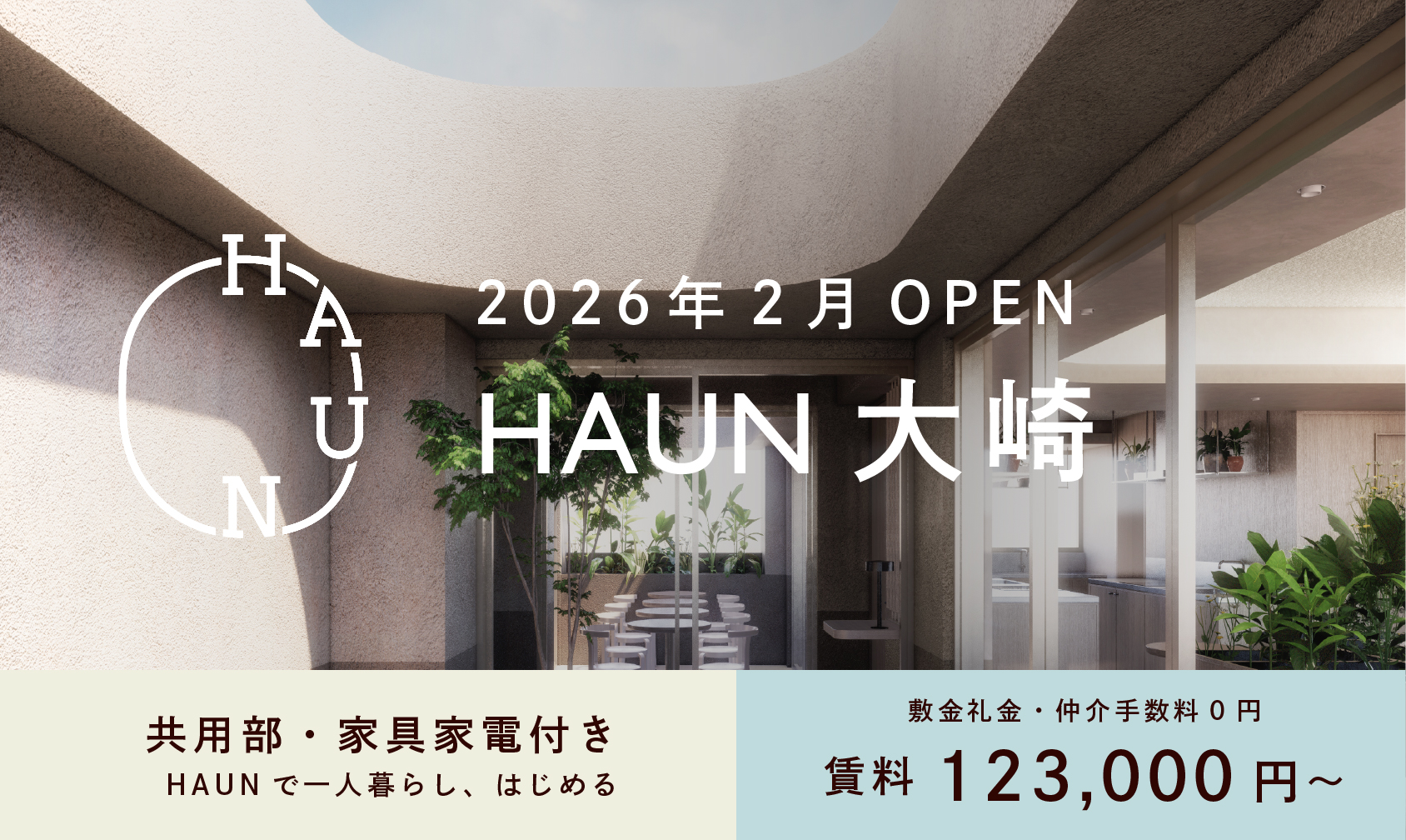 HAUN株式会社(東京都港区六本木6-2-31、代表:吉嶋法生)は、暮らし心地にこだわるコリビング*賃貸住宅「HAUN(ハウン)」を展開しています。このたび、都心近接のアクセス性と、働きやすさ・暮らしやすさがちょうどよく調和した、20〜30代に人気の「大崎・五反田エリア」に、都市に暮らす新しいかたちを提案するコリビング*賃貸「HAUN 大崎」を2026年2月1日(日)に開業することをお知らせします。