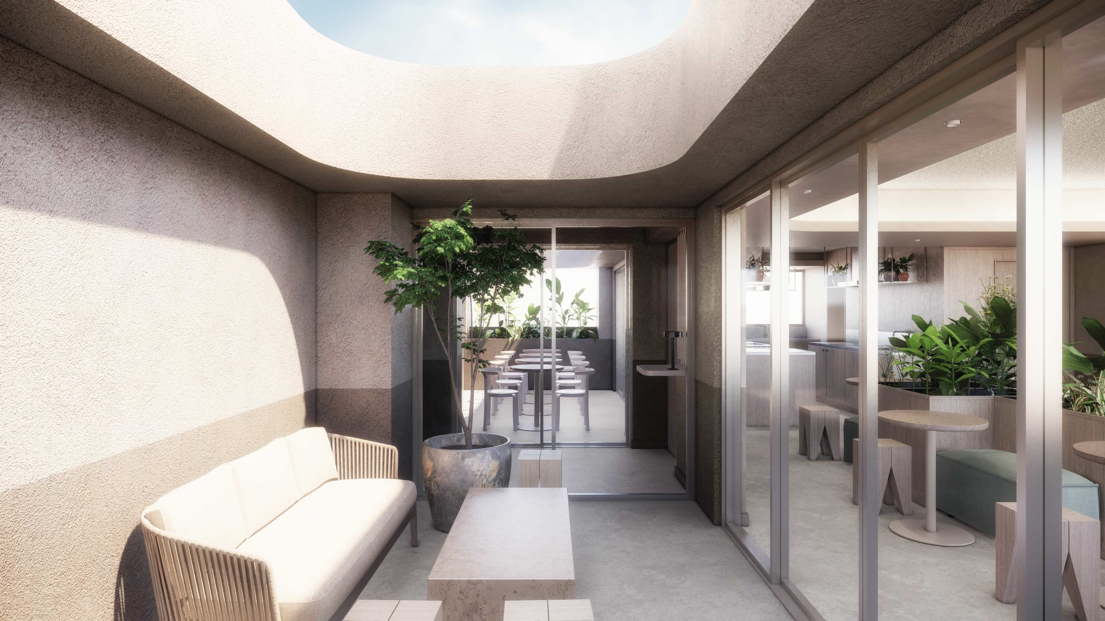 建築家と一緒に考えた「心地よい空間」には自然の手触りを感じられる豊かな植栽を配置。太陽の光や風が感じられ、人と遠すぎず近すぎない程よい間合いを考えた空間設計となっています。都心の一人暮らしでも、ご入居者様それぞれが「心地よい」を感じられるライフスタイルを提供します。