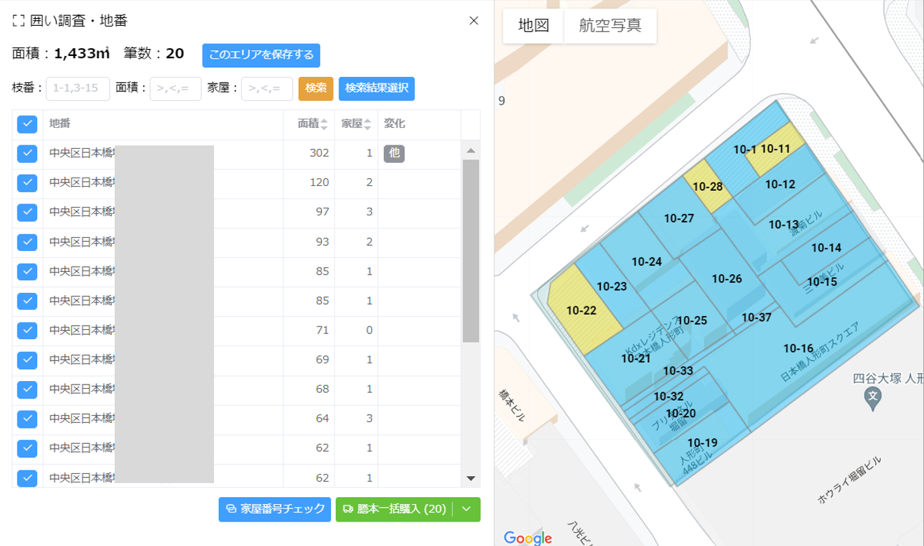 1. 地図から即座に登記簿取得「不動産チェッカー」 Googleマップ上で対象エリアを指定するだけで、その土地・建物の情報を即座に可視化します。