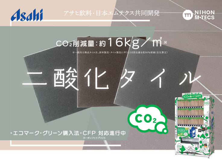 大気中のCO₂を吸収する自販機から吸収材を回収し、再利用した屋内用床・壁タイル。原料の90%以上がアップサイクル素材で、製造時のエネルギーを大幅に削減。通常タイルの約5倍の強度で防災性能も向上し、廃材配合でサステナブルな空間づくりに貢献します。